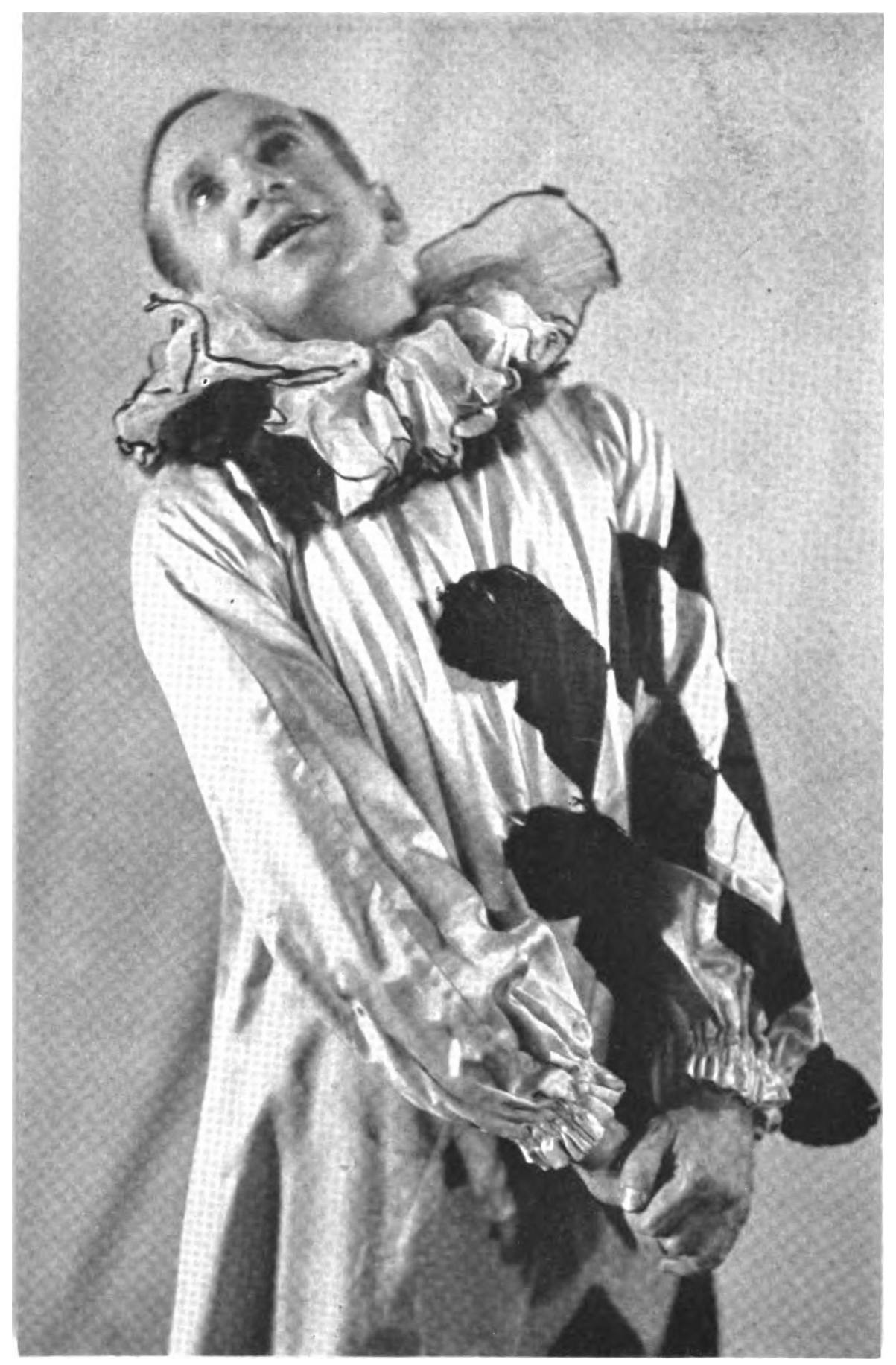 The Fratellini are so ingenious and so full of surprises that it is useless to try to keep up with them. I have seen them a dozen times since first writing about them, sometimes three times in a week with a still growing delight. Some of the stunts demand to be mentioned. There is one as good as the photographer—it is based on the idea that a saxophone player who cannot play the saxophone, is engaged because he has a starving family; another, concealed in a box, does the actual playing in the test before the manager of the house. The complications can easily be guessed; but it is impossible to guess the combination of delicacy and uproariousness with which they are rendered. At the end of this act Alberto, the grotesque with the square painted windows over his eyes, hides in a sack and you have one of the everlasting sources of children’s humour carried to its supreme conclusion. Still another stunt is a dancing act, first as a burlesque of ballet, and then as a straight tango, with Francesco as a rather wicked old dowager in a green dress, and Alberto with complete facial make-up, but otherwise extremely chic, dancing exquisitely. Finally, I mention another entrance, superior to the one described in the text. Francesco, very much the English gentleman, arrives on the scene, followed by his two servants, Paulo and Alberto, the former with a ludicrous exaggeration of the Englishman’s travelling rug, the latter with a wicker hamper of unimaginable proportions. As these two381 stagger after their master he tries to get out, as if he had come into the wrong place. Finally he addresses himself to an attendant, at the same time ordering his servants to drop their impedimenta. Before these two have time to light cigarettes, Francesco is off again, they must lift the huge burdens and follow him; again he orders them to discharge and enters into conversation; and this goes on until it works itself into a fury, the master always walking in one direction while the servants are so far behind him that they are walking in the opposite one. The human basis of the event, the skill with which it is done, and the intensity of it, are combined to make a miracle. At the end Alberto is so exhausted that he sees visions and begins to fight a duel with his own shadow; he leaps back, guards, and finally falls upon it and beats it to death.