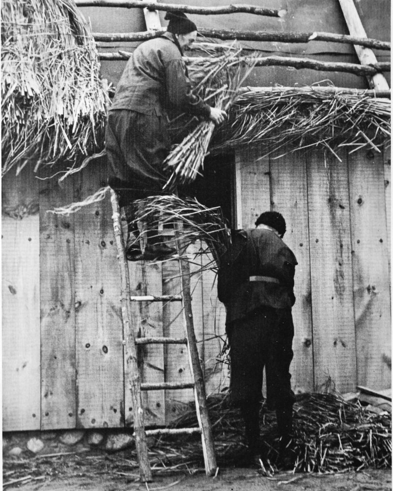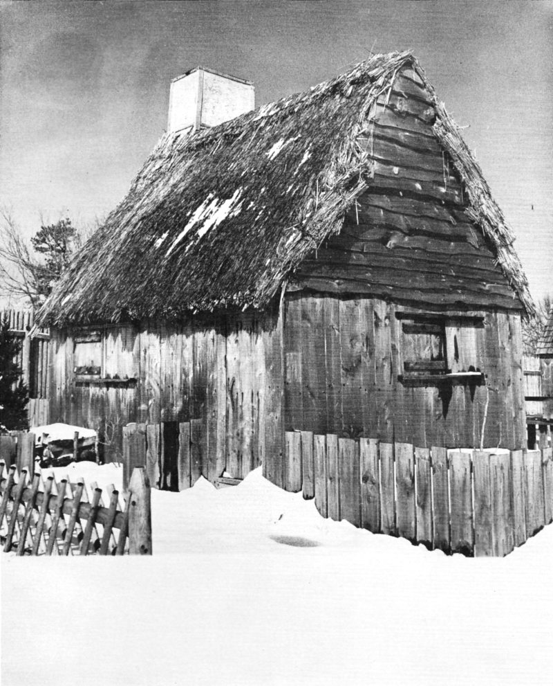 Members of the group early agreed that each family should build its own house, “... thinking by that course men would make more haste.” Roofs were thatched with bundles of rushes and grass, which provided a good watershed but could easily be fired by a spark from the chimney, as is graphically described in Mourt’s Relation.