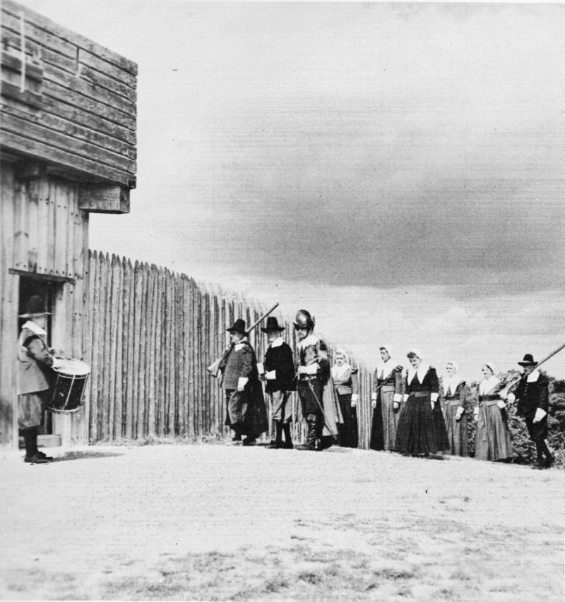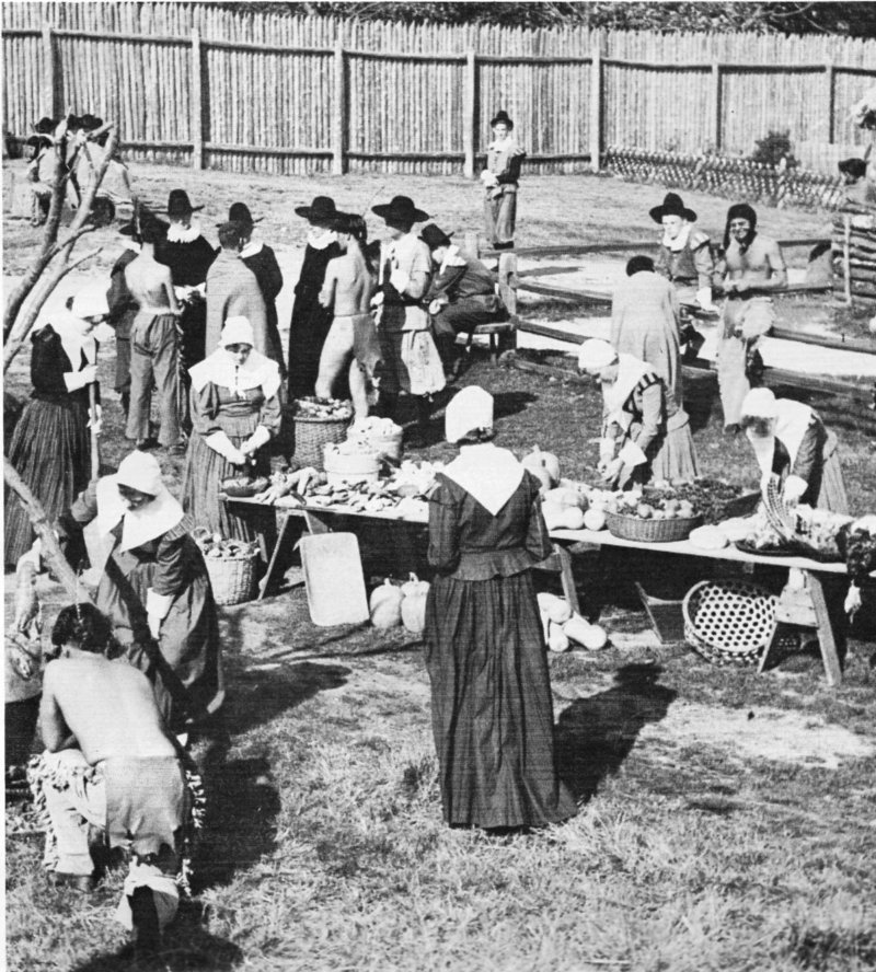 The preceding photographs illustrating modern reconstructions of things familiar to the Pilgrims were generously provided by Plimoth Plantation, in Plymouth, Massachusetts. The Plantation includes full-scale replicas of the Mayflower, the shallop, and the original settlement, much as they probably looked in 1627. During that year the first census was recorded and the herd which had been owned in common was divided. Records kept by administrators of the colony tell where the various houses were located, how much land was alloted to each household, and other relevant information. Historical research in such documents has been supplemented by archeological excavation to yield clues which allow plausible reconstruction. With such full-scale exhibitions, and through a continuing program of research and publication, this non-profit organization attempts to foster better public understanding of the adventure of the Pilgrims, which was first recounted in Mourt’s Relation.