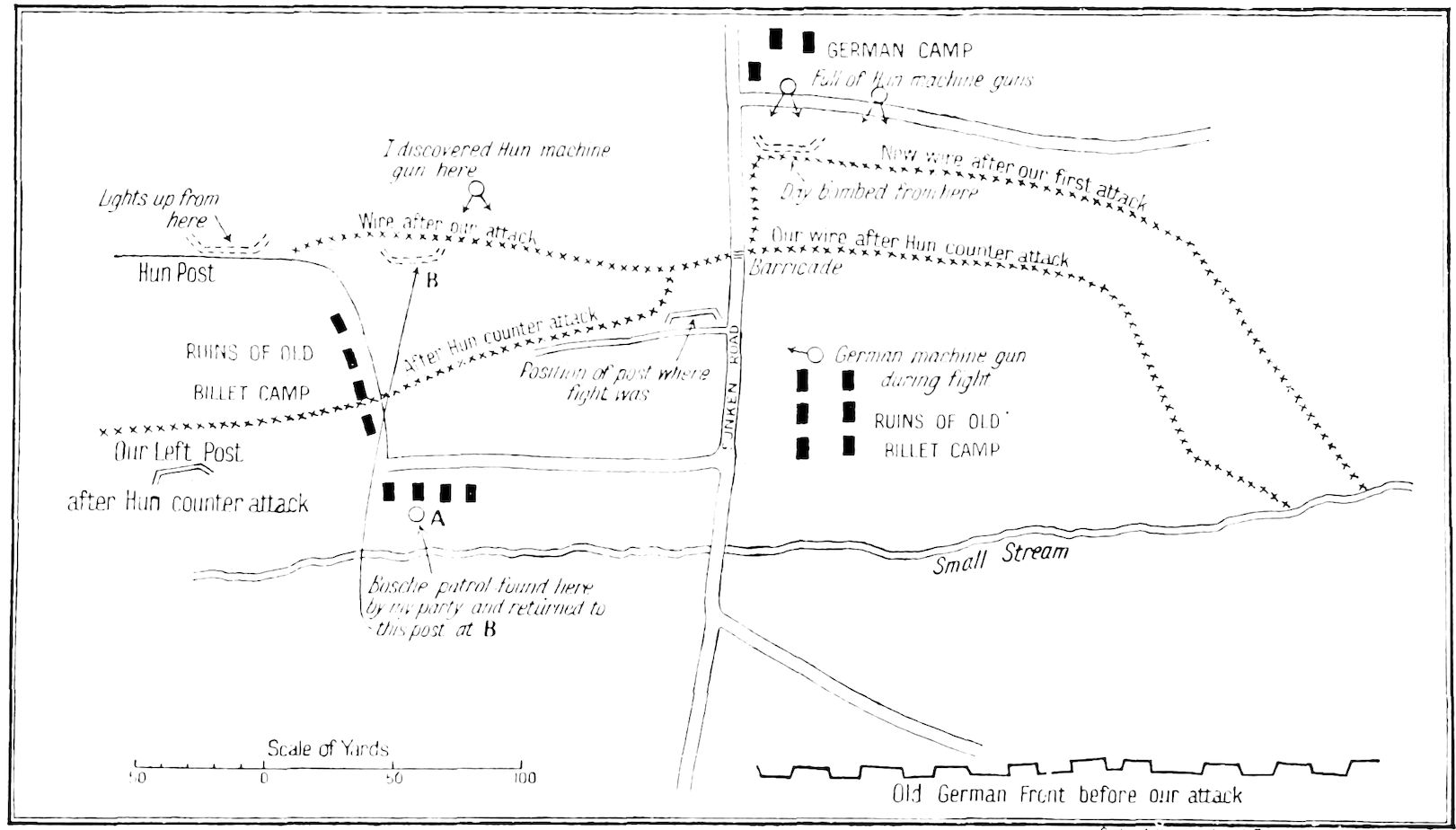 There was practically no cover on the road, but the night was dark and I felt fairly safe along the water’s edge. I calculated that I had gone 200 yards and then I waited, as I was a little nervous at having heard nothing, and felt certain that there would be posts along the road. After five minutes I heard the tapping of a mallet on stakes, and knew that they were wiring some 200 yards down the road. Still I waited, but I had no clear notion why. I assumed, of course, that there were protective troops on this side of the wiring party, but it was instinct rather than reason which made me halt. I was just preparing to go forward again when two men rose out of the road 183not 15 yards away, walked a few paces up and down the road, and then appeared to lie down again. I had all but walked on to their rifles and my heart thumped crazily. There was nothing for it but to take to the water and the marsh. I retreated 20 yards and waded in, holding my revolver over my head. It was deathly cold, and after about 100 yards I nearly gave it up—at times the water was up to my shoulders and I seemed to make no progress. The noise of the working party guided me, and eventually I judged that I was behind them and therefore about in line with the first small bridge.