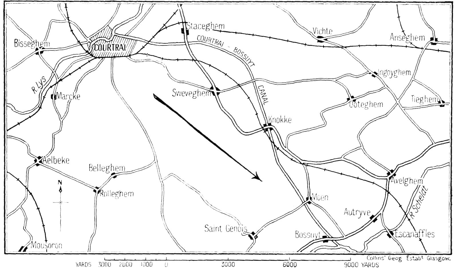 Oct. 22. Apparently some of our people have got across the canal farther to the north, and at 9 a.m. the attack was resumed on that side with a view to forcing the Huns out of their position. Our orders were to co-operate by means of a demonstration against the canal, but the machine-gun fire was too heavy and we could do nothing except waste a lot of ammunition. I only remember seeing a German once during the whole day, and yet the slightest exposure on our part was answered by an immediate burst of fire—they stuck it very well, because 169the fighting on their right flank was very heavy and they would all have been taken if we had got through. For several hours during the morning the rifle and machine-gun fire on our left was very heavy, and the 18–pounders were continuously in action. Towards noon a battery of 68–pounders came into action and also some howitzers—several fires broke out in the houses, but the shells had no effect on the concealed gunners in the canal banks, and we waited in vain for the blue rocket that was to signal us forward. About two o’clock an intelligence officer came round and we learnt that the Germans stuck very hard this morning—we made practically no progress as a result of the battle, and our losses have been heavy.