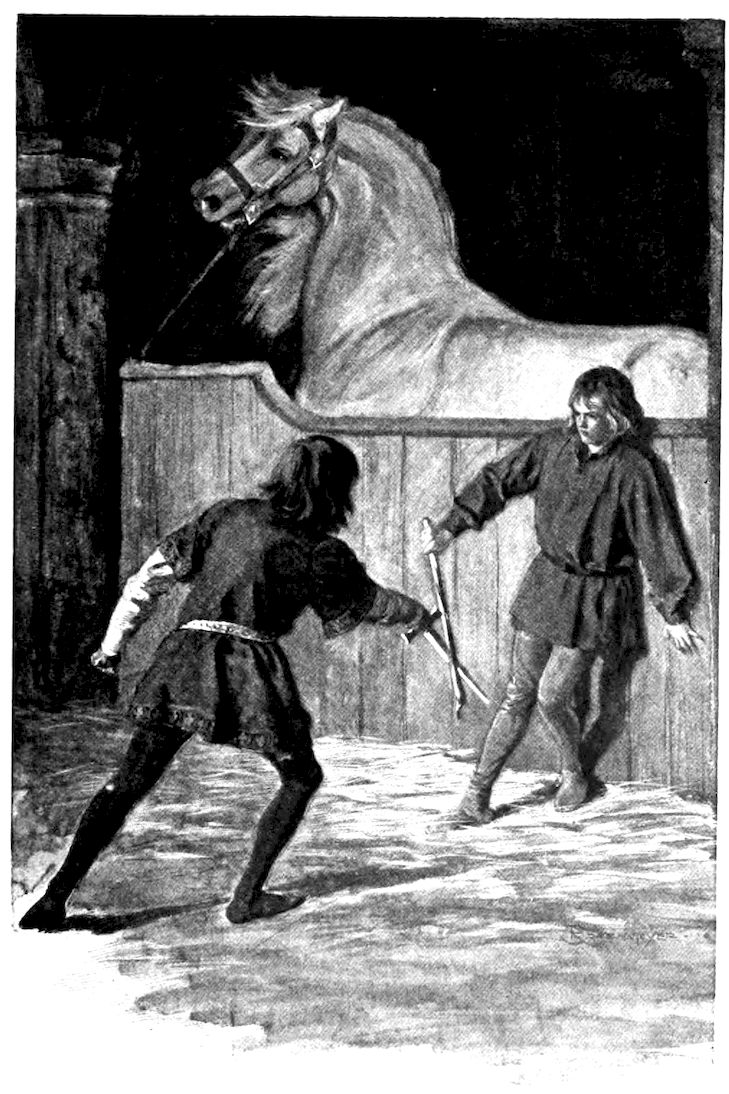 The shining stranger was a knight of valor, despite the unwillingness he first showed. He laid on stoutly with his blade, so that more than once his foe reeled in saddle; but the black knight came back each time with greater fury, 14while the stranger and his horse were plainly weary.