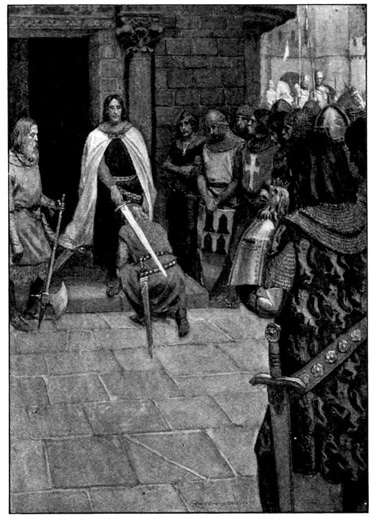 “We know not, your Majesty,” one of the squires replied; “but we found him in a cell high up in the keep, chained by 201the ankle to a stone bench, and I broke the fetter with a sledge.”