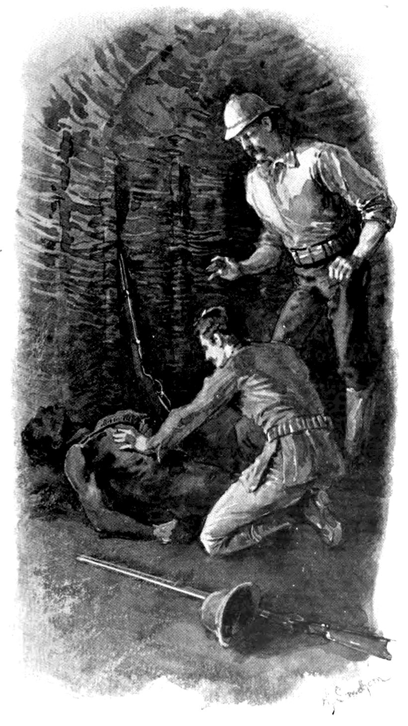 It was not the time or place for argument. The report from Gaston’s rifle rang out sharply, and the first savage pitched headlong and lay still, a thin, dark stream trickling from the body over the earthen threshold. The second, I dropped also, but not so neatly, for he wriggled like a big black snake into the underbrush, and was lost to sight. Seeing which I turned to look at our visitor, but here again Lestrade was quicker than I.