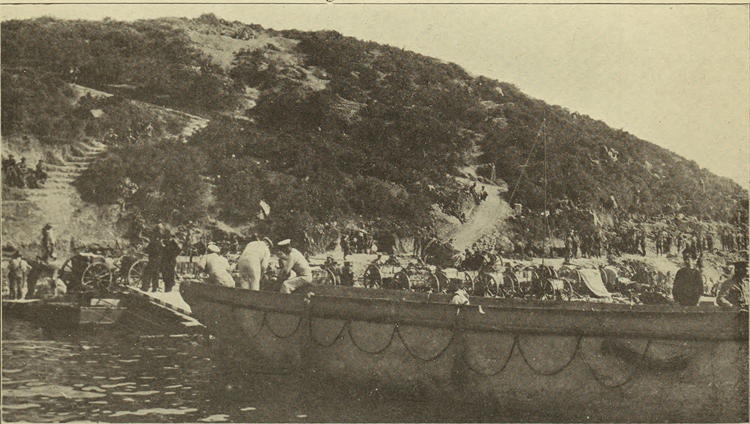 On the morning of the 24th April the transports anchored off Tenedos. The day was occupied in transferring the troops to a number of cutters and smaller war vessels, and at midnight these were taken in tow by certain of the larger ships, and, silently and without lights, moved away through the darkness, stringing out into long, serpentine lines, towards Gallipoli.