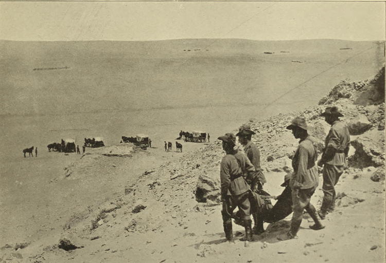 HEROES FROM THE DARDANELLES. Wounded from the Dardanelles, leaving the hospital train in Egypt.