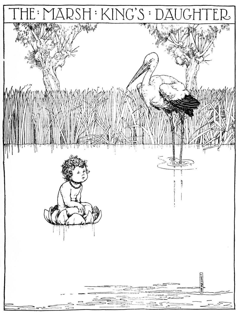 The days and months went by. He saw at last one day that right from the bottom of the marsh a green stalk pushed up till it reached the surface of the water. Out of it grew a leaf, that grew wider and wider, and close to it a bud put out. Then one morning, as the stork was flying over it, it opened, with the sun’s warmth, into a full-blown flower, in the middle of which lay a beautiful child, a little girl, as if she were fresh from the bath. So like was the child to the princess from Egypt, that at first the stork believed it to be herself turned a child again. But when he thought it over, he decided that it was more likely to be the child of the princess and the Marsh King, and that was why she was lying in a water lily.