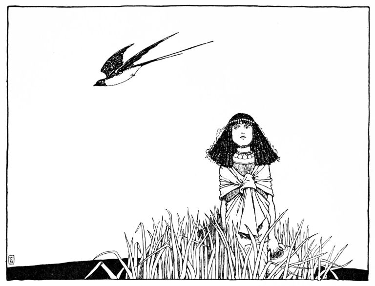 ‘We all three flew high in the air: a hunter saw us and shot an arrow; it struck our friend, and singing her farewell, like a dying swan, she slowly sank, in the midst of a forest lake. There we buried her, near the shore of the lake, under a fragrant weeping-birch. But we took our revenge! We bound fire under the wings of a swallow which had built under the hunter’s thatched roof! The thatch caught; the house blazed up! He was burned in it, and the light shone over the lake as far as the drooping birch tree under which she is buried. She will never come back to the land of Egypt.’