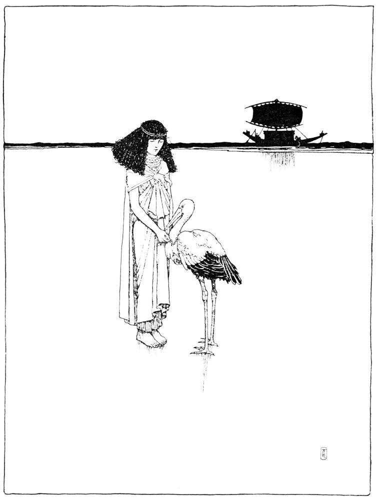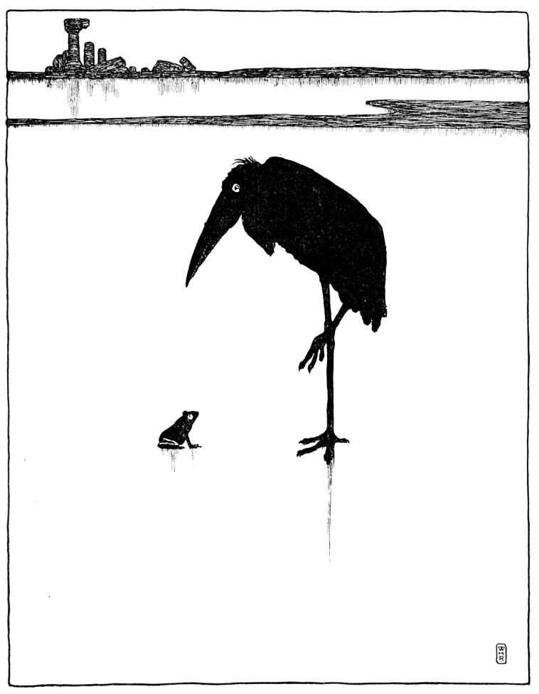 ‘There is nothing better to see,’ said mother-stork. ‘At that green border is only a wild wood, where the trees crowd one upon another, and are entangled together with thorny creepers. Only an elephant with his clumsy legs can make a way there. The snakes are too large for us, and the lizards too lively. If you try to go into the desert you get your eyes full of sand in fair weather, and if there is much wind, you find yourself buried under a sand-heap. No, this is the best place. Here are frogs and locusts. I shall stop here, and you must stay with me.’ And they stayed.
