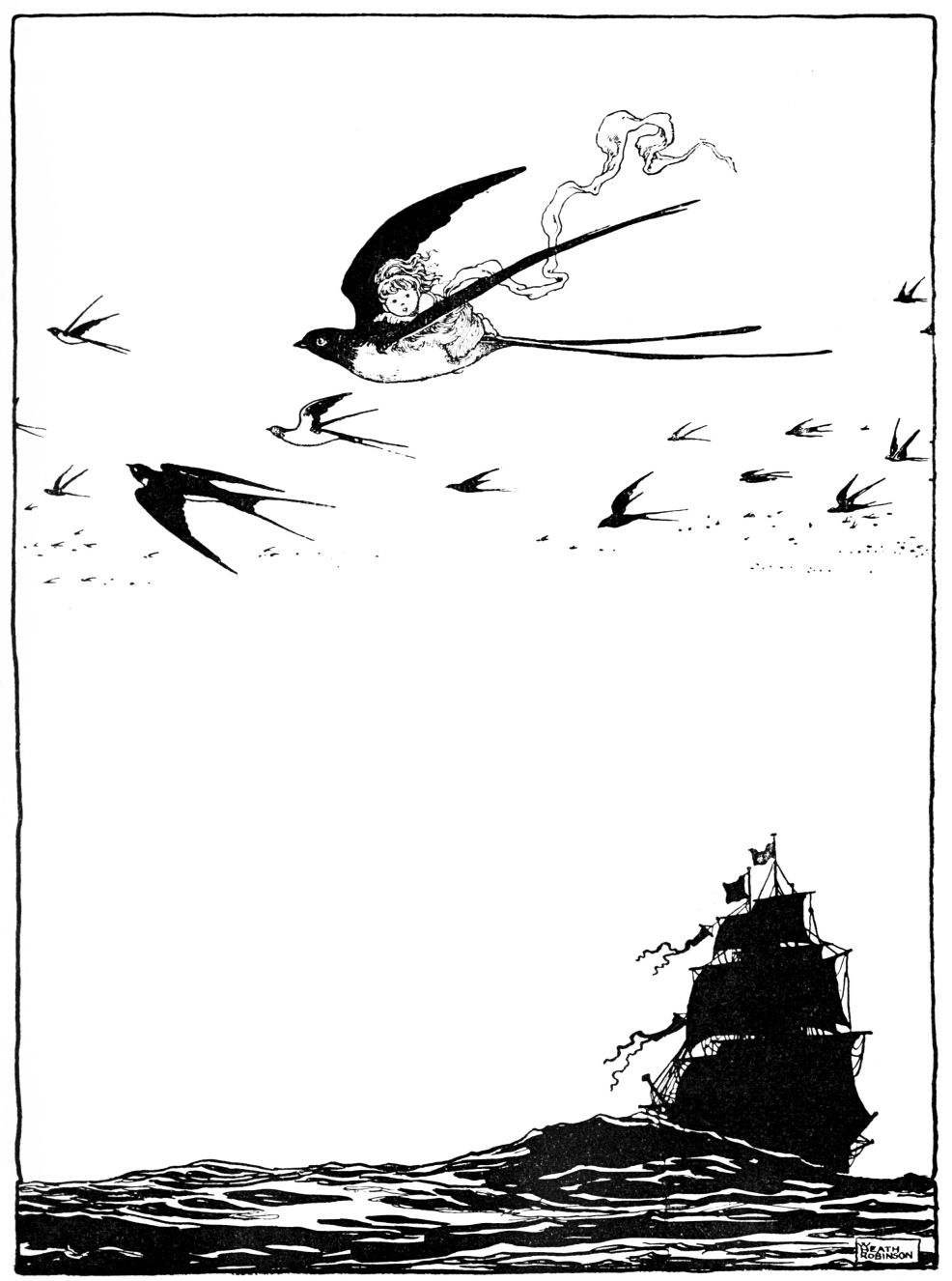‘Hark ye,’ said they, ‘you are so ugly that we like you infinitely well; will you come with us, and be a bird of passage? On another moor, not far from this, are some dear, sweet, wild geese, as lovely creatures as have ever said “hiss, hiss.” You are truly in the way to make your fortune, ugly as you are.’