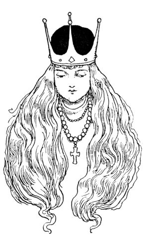 The Viking’s wife sat on the cross-bench in the open banqueting-hall. She wore a robe of silk, with bracelets of gold and beads of amber. She had put on her dress of state, and the bard sang of her, and told of the golden treasure she had brought to her wealthy lord, while he was delighted with the beautiful child, for he could see it by day in all its loveliness. He was well pleased with the baby’s wildness, and said she would become a right warrior-maid, and fight as his champion. She did not even blink her eyes when a skilful hand cut her eyelashes with a sharp sword as a rough joke.