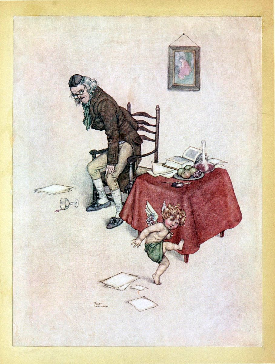 All the good boys and girls to whom he related this story were on their guard against the wicked boy, Cupid; but, notwithstanding, he made fools of them again and again, he is so terribly cunning! When the students are returning home from lecture, he walks by their side, dressed in a black gown, and with a book under his arm. They take him to be a fellow-student, and so they suffer him to walk arm-in-arm with them, just as if he were one of their intimate friends. But whilst they are thus familiar with him, all of a sudden he thrusts his arrows into their bosoms. Even when young girls are going to church, he will follow and watch for his opportunity: he is always waylaying people. In the theatre, he sits in the great chandelier, and kindles such a bright, hot flame, men fancy it a lamp, but they are soon undeceived. He wanders about in the royal gardens and all the public walks, making mischief everywhere; nay, once he even shot thy father and mother to the heart! Only ask them, dear child, and they will certainly tell thee all about it. In fine, this fellow, this Cupid, is a very wicked boy! Do not play with him! He waylays everybody, boys and girls, youths and maidens, men and women, rich and poor, old and young. Only think of this: he once shot an arrow into thy good old grandmother’s heart! It happened a long time ago, and she has recovered from the wound, but she will never forget him, depend upon it.