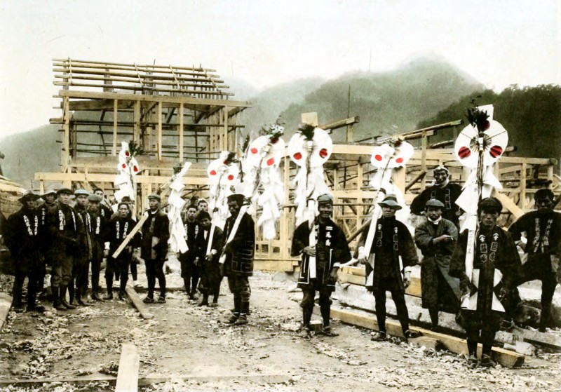 After hard labour taken by the carpenters and coolies, employed specially for the day of building, under an earnest management of the head carpenter, the building or framing work is completed at sunset. The celebration poles are made each bearing three fans indicating type of rising sun, fastened together and decorated with green leaves, five coloured hemp threads and white paper cut in the way indicating sacredness. And the carpenters carry them, making a procession together with the coolies singing songs celebrating the success. Then they stop first at the gate of the owner of the new building and leave there, one of the decorations, and the family gives them a feast and “sake” for the celebration.