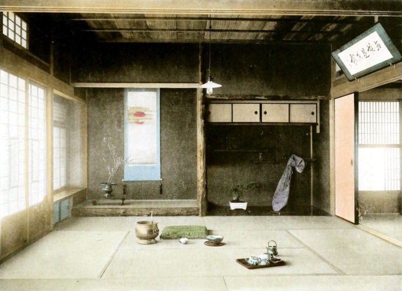 This is one of the best rooms, intentionally made for receiving guests. Artistic and expensive woods are used for the poles and floor of the “Tokonoma,” or, place of honour. Chosen woods are used for the ceiling. Also, much pains is taken for choosing “Shoji” paper doors for the rooms and “Fusuma” (paper doors between rooms,) to make the room an artistic and refined one.