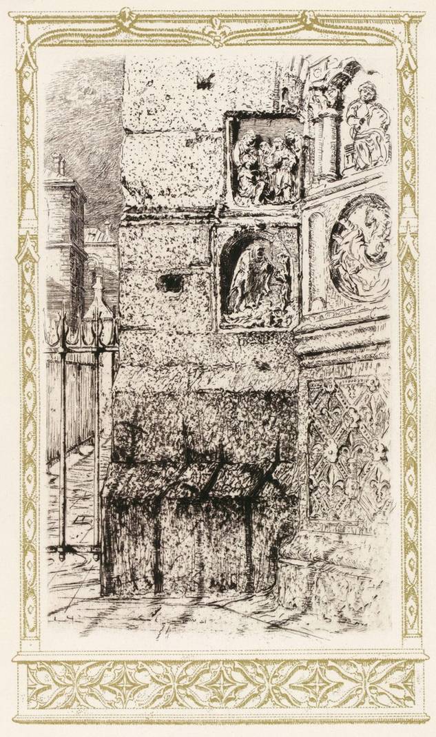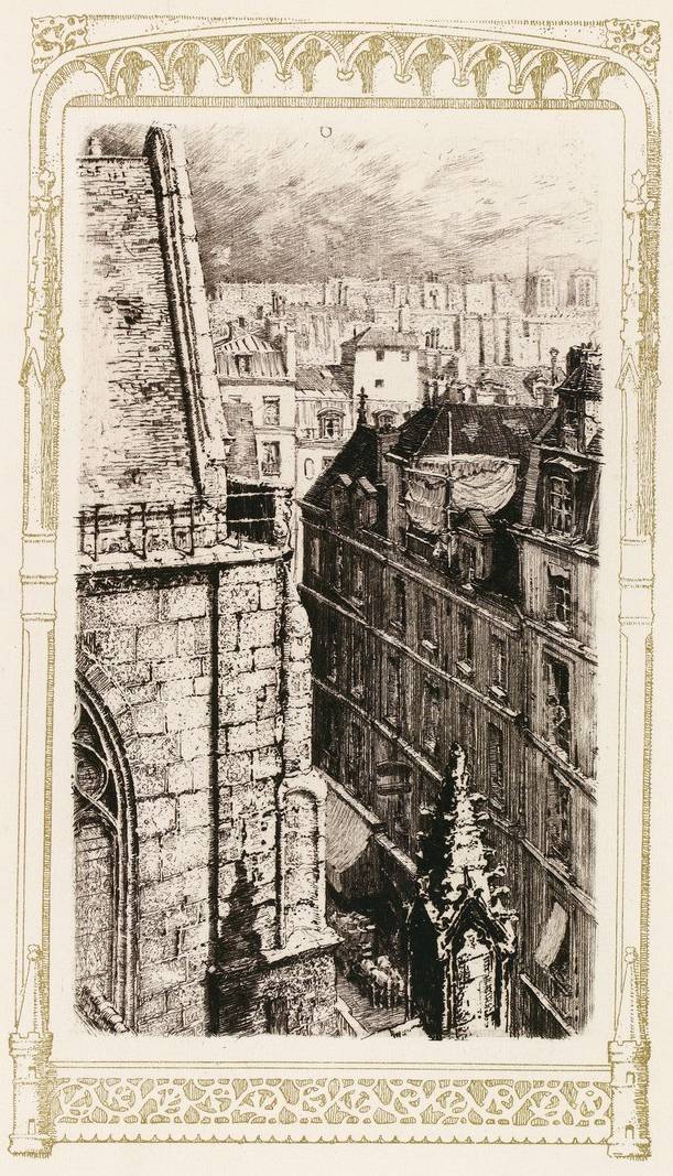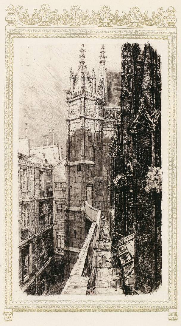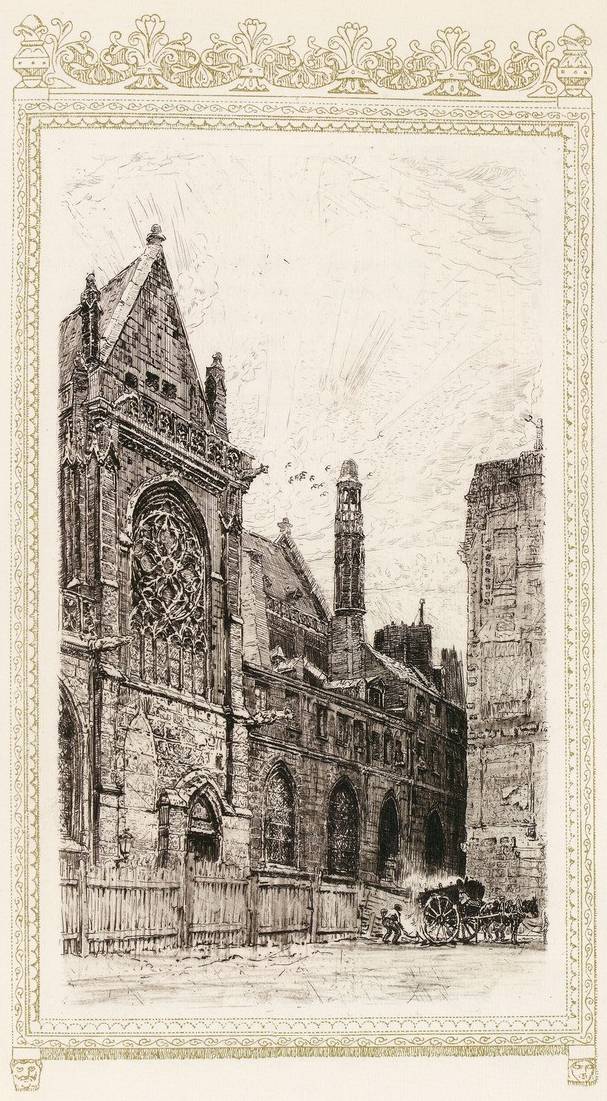 Telle est présentement l’église Saint-Merry. Plus heureuse que la plupart de ses sœurs de Paris, elle n’est pas isolée dans un milieu moderne et elle demeure en accord avec les très anciennes rues qui l’avoisinent et qui n’ont pas encore subi la stupide emphase des constructions en fer et en plâtre de notre temps. Il y a, là, autour d’elle, des ruelles délicieuses et infâmes, entre autres une certaine rue Taillepain que l’on retrouve, avec le même nom et avec la même forme, sur le plan de Turgot. Elle ressemble à une pipe, couchée sur le sol et sur le flanc ; le tuyau part de la rue du Cloître-Saint-Merry, en face de la grande fenêtre du transept, et le fourneau s’évase, en carrefour, dans la rue Brisemiche.