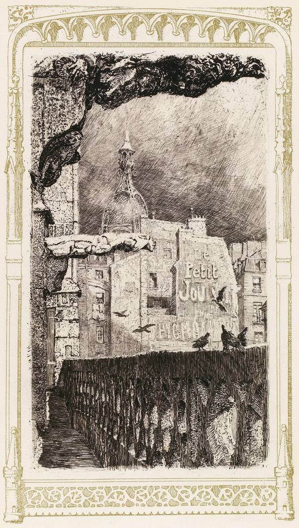 Cette rue Taillepain est un couloir bordé par des dos de maisons ; presque toutes sont privées de portes et n’ont que des fenêtres, démesurément carrées ou qui montent, alors, trop allongées, de guingois, encadrant, dans leurs liserés de pierres sales, des paysages dessinés avec de la poussière, sur d’invisibles vitres ; celles qui ont des entrées se contentent, en fait d’huis, de simples fentes, surmontées, à hauteur d’homme, de barreaux de fer ; l’on dirait de meurtrières de défense et de poternes d’attaque ; tout le quartier est misérable, mais il efflue un relent de vieille truandaille qui réjouit. Les sentes sont façonnées par des devants d’hôtel, noirs et gluants, qui arborent sur des écriteaux cette inscription : « On loge à la nuit » ; les boutiques sont obscures et partout des réflecteurs dépassent l’alignement des façades et s’efforcent de projeter un peu de jour dans les ténèbres des pièces. La majeure partie est occupée par des marchands de vin de dernier ordre, des bistros pour souteneurs, surtout par des magasins de rapetasseurs de chaussures, par des échoppes de vieilles bottes ; c’est le marché des ripatons usés !