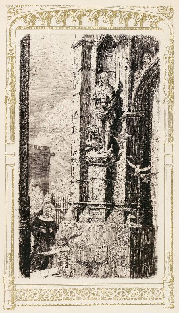 A les entendre, le récepte, le secret de la sublime pierre des sages est inscrit sous la statue qui se dresse sur le trumeau, tranchant en deux la baie. Cette statue, — qui n’est qu’une reproduction, car l’original est placé dans la salle des Thermes, au Musée de Cluny — portraiture un évêque, debout, mitré et crossé, bénissant d’une main ses visiteurs et foulant aux pieds un dragon sorti d’une sorte de chapelle funéraire où une femme morte est assise dans un linceul enveloppé de flammes.