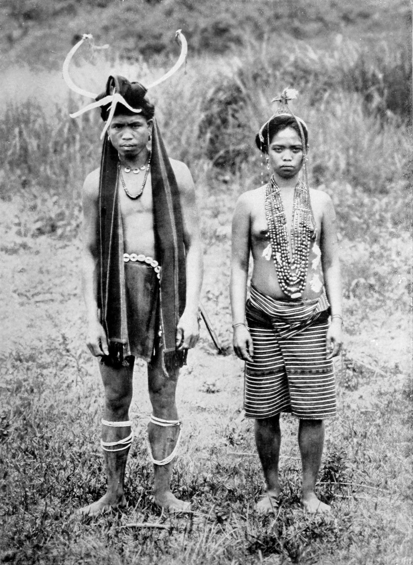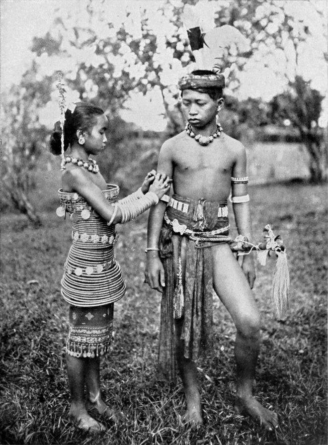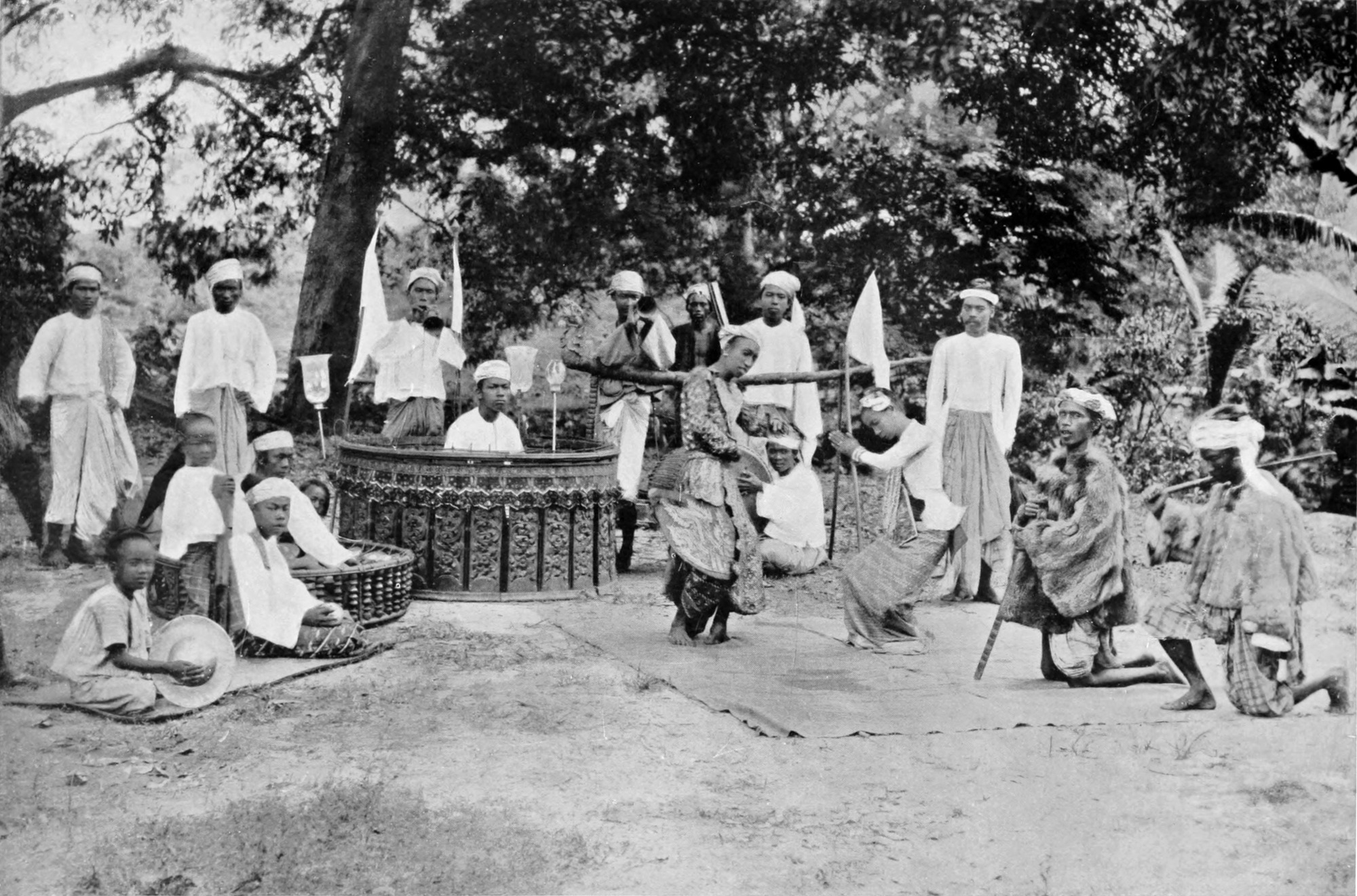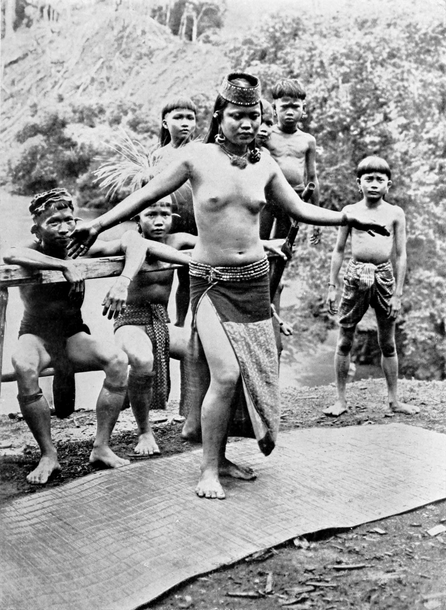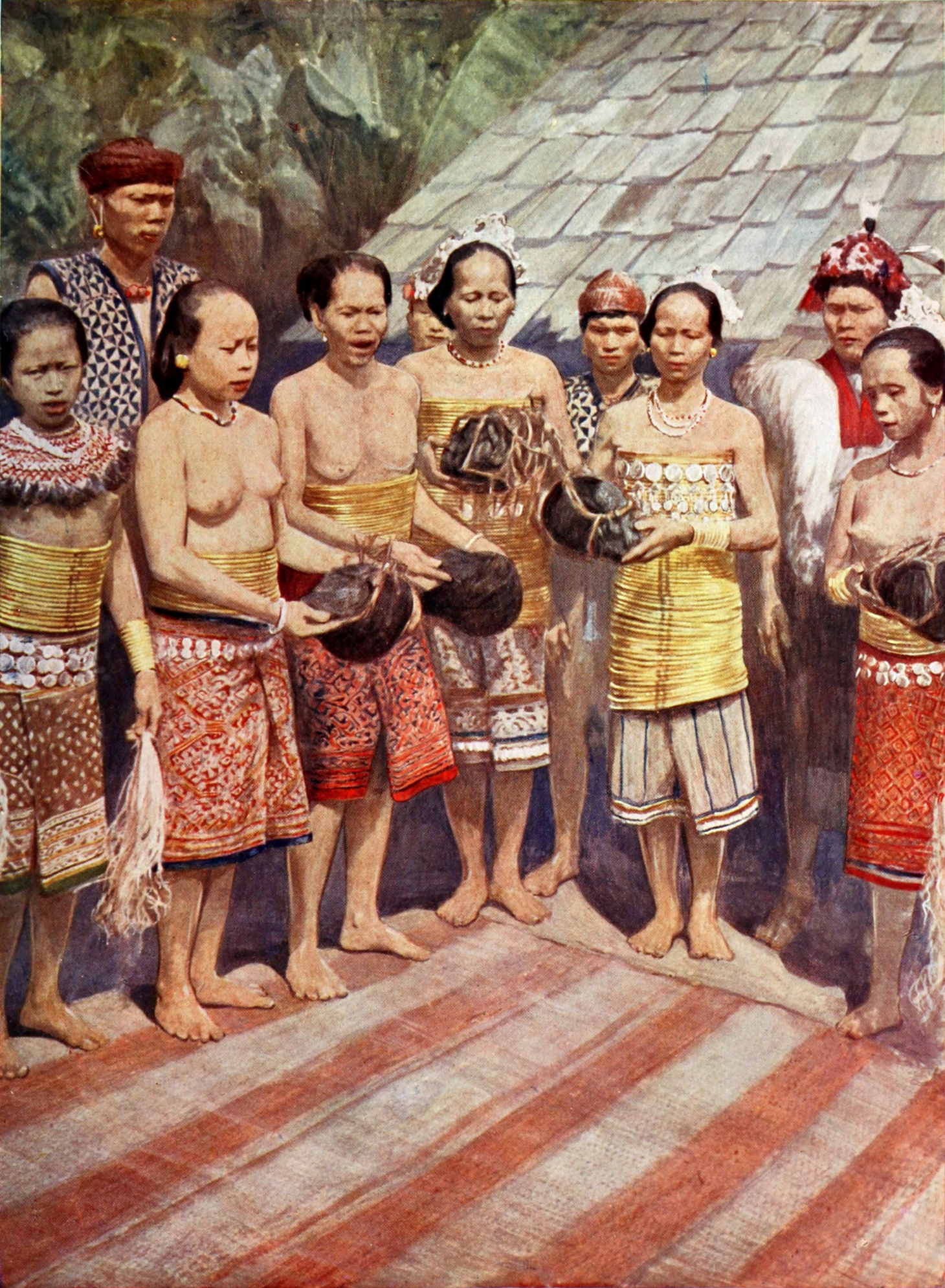 Dajakfrauen mit Menschenschädeln in den Händen, zu einem Tanze versammelt