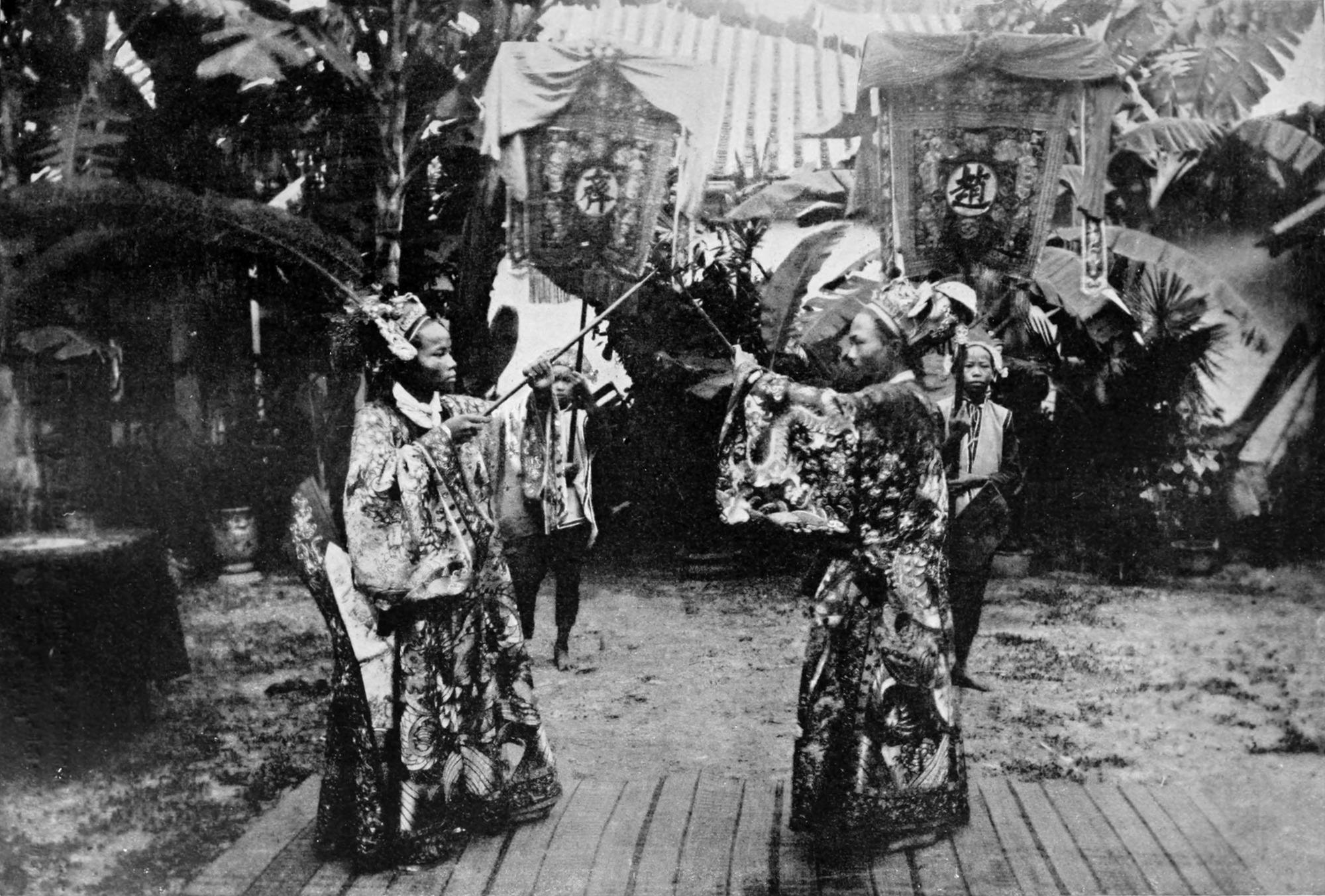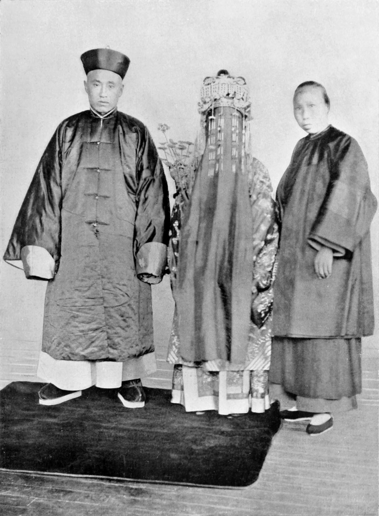 der Bräutigam in Mandarinenkleidung, aber ohne Rangabzeichen (Perlenhalsband und Stickerei auf der Vorderseite des Rockes), die Braut in prunkvollem Kopfputz, der ihr Gesicht ziemlich verbirgt.