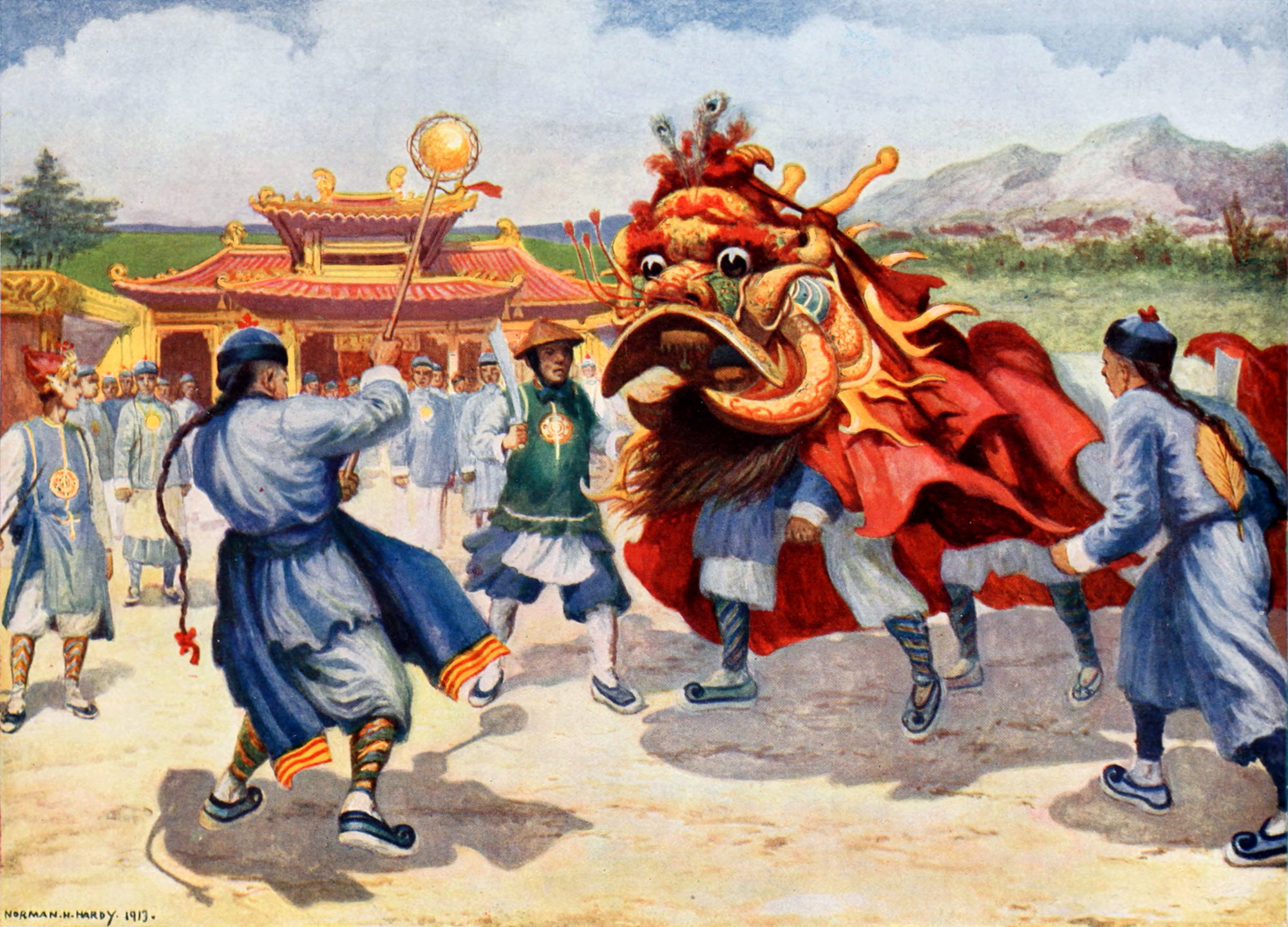 Ein großer Drache wird von Männern in Schlangenlinien durch den Ort bewegt; ein Chinese mit einer goldenen Kugel auf einer Stange, die die Sonne darstellen soll, und die der Drache zu verschlingen versucht, läuft ihm voran, zwei andere Personen greifen ihn mit Messern von der Seite an. Die ganze Prozession zieht auf einem großen offenen Platz umher, von kleineren Drachen und einer Musikkapelle begleitet, die die Totengeister verjagen soll.