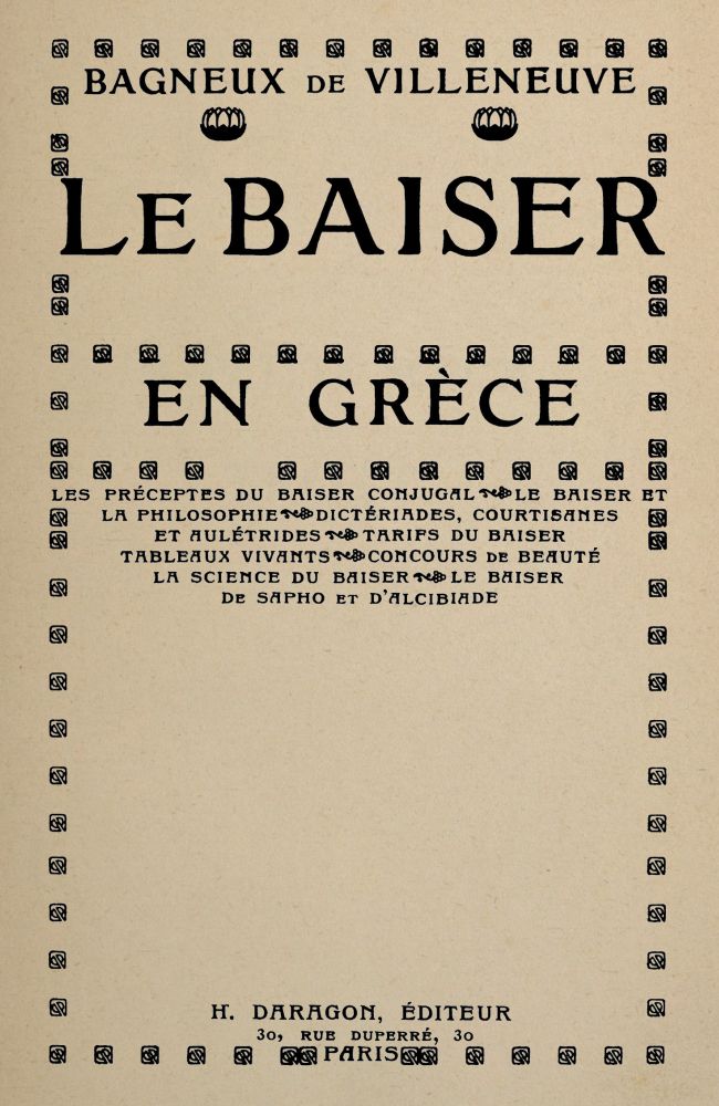 LES PRÉCEPTES DU BAISER CONJUGAL — LE BAISER ET LA PHILOSOPHIE — DICTÉRIADES, COURTISANES ET AULÉTRIDES — TARIFS DU BAISER — TABLEAUX VIVANTS — CONCOURS DE BEAUTÉ — LA SCIENCE DU BAISER — LE BAISER DE SAPHO ET D’ALCIBIADE