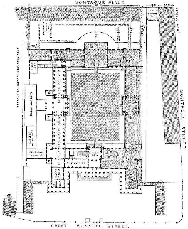 Your Committee are of opinion that the new building facing Montague Street, the building for the bookbinder, the building intended to be erected on the ground now vacant between the Elgin Room and the Print Room, and the construction of the new principal staircases, should be commenced immediately. The building intended to be erected on the vacant ground on the west of the Trustees’ Room (No. 11 on the plan), must, necessarily, be postponed for awhile. The alterations which might and ought to be rapidly completed, are those which will be required on the east side of the King’s Library (No. 55 and 57), to transfer the gallery to the Department of MSS. from that of Printed Books.