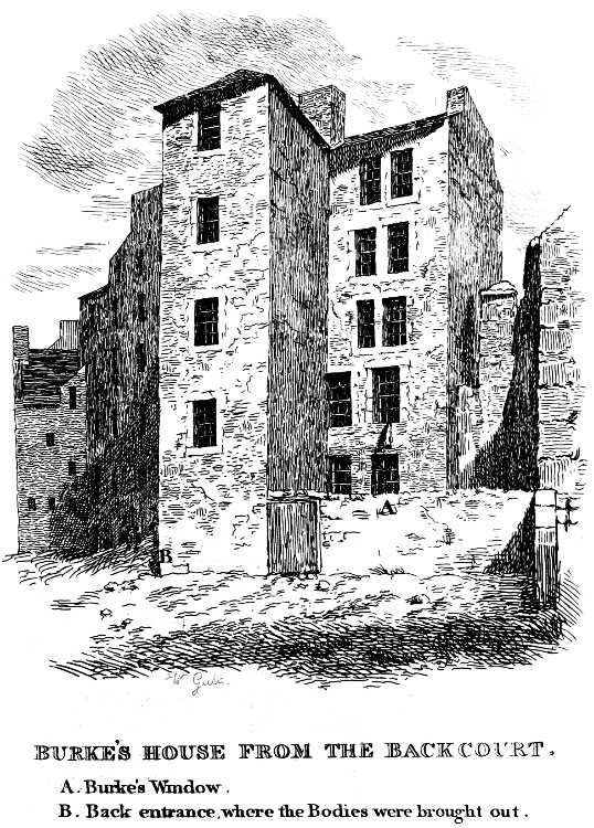 “On Friday, the 31st of October, a little elderly woman was seen begging about the West Port: she entered the shop of Mr. Rymer, adjacent to Burke’s house, for this purpose, when Burke was there purchasing whisky. He seems to have immediately fixed upon her as a fit subject for his atrocious purposes, and endeavoured to decoy her into his power. He asked her name, and what part of Ireland she came from; and upon receiving her answers, replied that he was from the same place, and that she must be a relation of his mother, whose name was Docherty. He then promised to give her breakfast, and they left the shop together, and were seen to enter Burke’s house. She was afterwards seen in the house at different times during the day; and two lodgers, Gray and his wife, were sent to Hare’s house to make room for her, under the pretence that she was a friend from Ireland. They were afterwards seen making merry, drinking and dancing in company with Hare and his wife, first in the house of Ann Connaway, and afterwards in Burke’s. During the night, a great noise of quarrelling and cries of murder were heard in Burke’s house; but the neighbours, knowing that two men and three women were in the house, and having frequently heard similar uproars, did not think much of it, nor interfere. One of them, however, had the curiosity to look through the key-hole, when he saw M‘Dougal holding a bottle to the mouth of Campbell, swearing at her for not drinking, and pouring the whisky into her mouth. Then all was quiet for a little. Shortly after, the noise again commenced, which was again succeeded by silence. At this time, that is, between 11 and 12 o’clock, it is presumed the horrid deed was perpetrated.