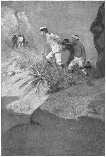 [371]While the water boiled above the swiftly revolving propellers slowly hauling the gunboat backward from its perilous position on a coral reef, all but two of the natives in the fishing boat climbed nimbly aboard and ten eager sailors, their rifles in hand, scrambled in.
