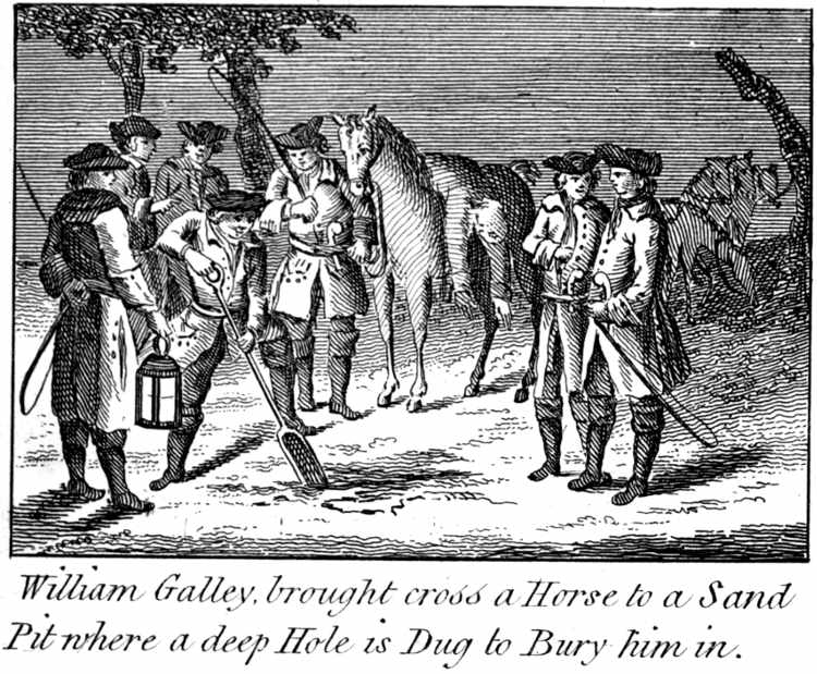 William Galley, brought cross a Horse to a Sand Pit where a deep Hole is Dug to Bury him in.