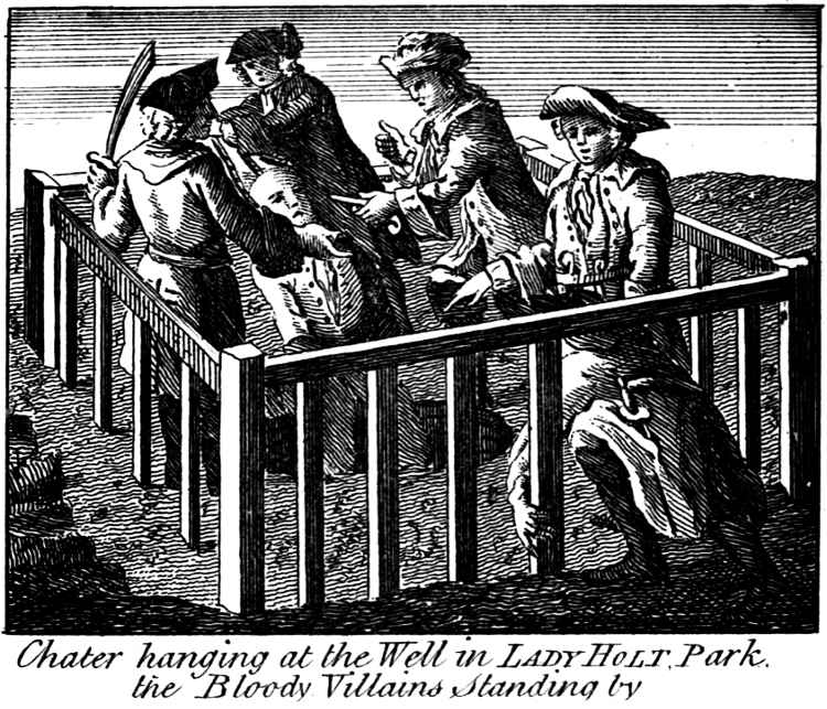 At last poor Chater, in this disfigured lamentable condition, is brought to the well. By the time they got there, it was the very dead of night, and so near the middle of it, that it was uncertain whether it was Wednesday night or Thursday morning. The well was between twenty and thirty feet deep, without water, and paled round at a small distance to keep the cattle from falling in. Being come up to the pales, they dismounted Chater, and Tapner, taking a cord out of his pocket which he had brought for that purpose, made a noose in it and then fastened it round his neck. This being done, they bade him get over the pales to the well. The poor man observing a small opening, where a pale or two had been broken away, made an attempt to go through; but that was a favour too great to be allowed to so heinous an offender, as it seems poor Chater was in their opinion; and therefore one of them swore he should get over in the condition he was and [27]with the rope about his neck, all over blood, his wounds gaping and himself extremely weak and ready to faint through loss of blood; yet in this miserable plight these cruel executioners obliged him to get over the pales as well as he could.