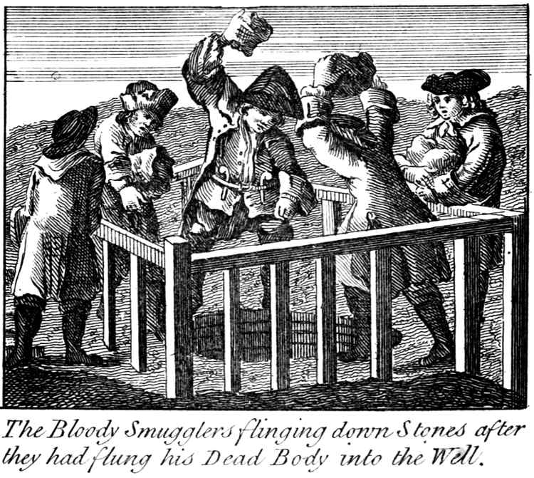 The Bloody Smugglers flinging down Stones after they had flung his Dead Body into the Well.