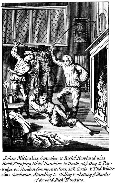[11] This John Mills is the same person as went by the name of Smoker, who was condemned at the last assizes at East Grinstead, for the county of Sussex, for the cruel murder of Richard Hawkins, and is hung in chains near the Dog and Partridge on Slindon Common; and whose trial follows this account of the seven condemned at Chichester.