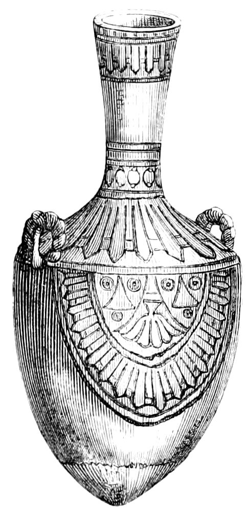 Acratophorum, Gr. and R. (ἀκρατο-φόρος, holding unmixed wine). A table vessel for holding pure wine, while the crater (κρατὴρ), on the other hand, contained wine mixed with water. These vessels were often dedicated to Bacchus. They were made in earthenware and metal, but those that were dedicated to the gods were of gold and silver, and had their place among the treasures of the temples. Fig. 7 represents a silver acratophorum found at Hildesheim.