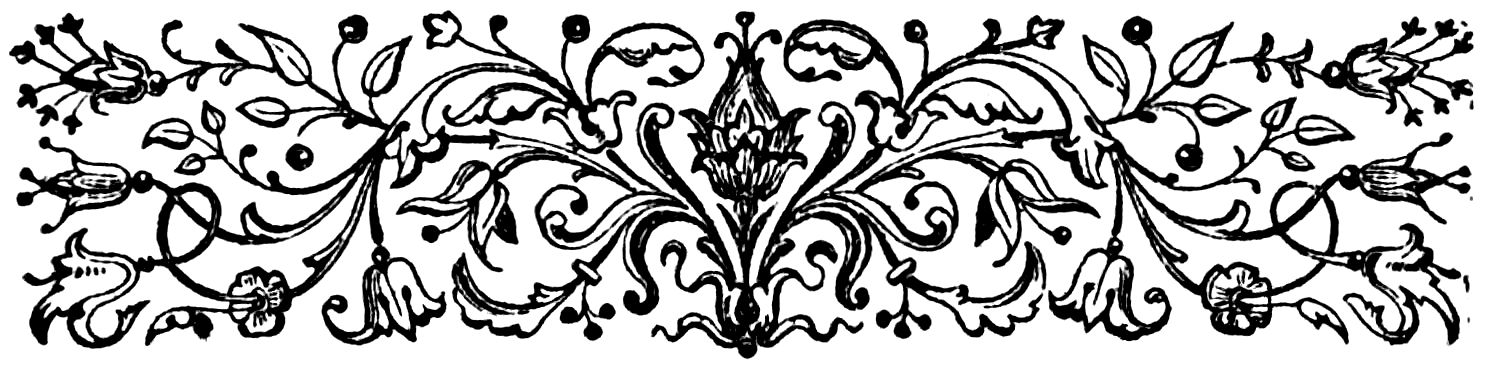 Right seemly she looketh, thought I, as I stood behind her chair when they supped. Never before had she borne 19herself so bravely, and rich were the gauds that tirewoman furnished forth. One evening my Lady came into the great hall in a gown of cherry red, made from the thread of the silkworm and wonderous soft and fine. Above this was a long coat with wide pointed sleeves, and it was bound about her with a sash of cloth that shone like silver. Her hair was woven with strings of pearls, large and white, and over her hung a veil like unto a spider’s web, set full with shining threads. Well do I remember all this, for it was the first time that ever I had seen such richness of apparel.