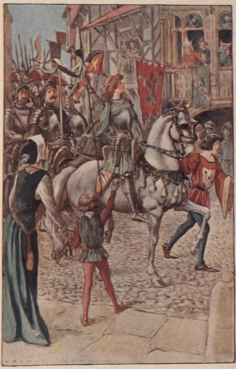 We hurried forward. As my Lord rode into the court, the Due de Berry cometh through the door to meet him. He was elder than my Lord, and was uncle to King Charles, and a powerful and noble lord. Never had I looked on one so great as he. All France hath heard how he taxed his people and gathered from them great stores of money that he might have gold to buy palaces, that he might get from strange and foreign countries noble pictures 18with which to deck his walls, and tapestries wrought in coloured threads and gold. Not only these things did he buy, but books enriched with jewels and filled with images of saints and others, coloured with blue, red, and gold. After him rode hundreds of followers when he went to war or travelled abroad in strange countries.