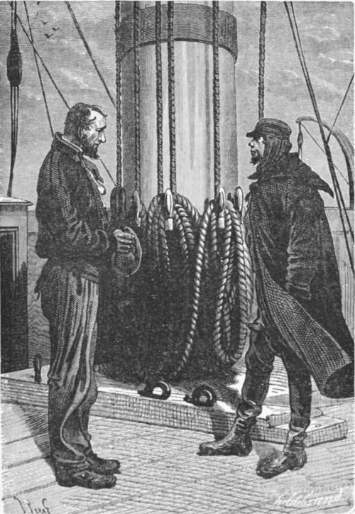 At this moment, and in spite of his orders, Mr. Halliburtt and his daughter went to James Playfair on the poop; the latter urged them to return to their cabins, but Jenny declared that she would remain by the Captain. As for Mr. Halliburtt, who had just learnt all the noble conduct of his deliverer, he pressed his hand without being able to utter a word.