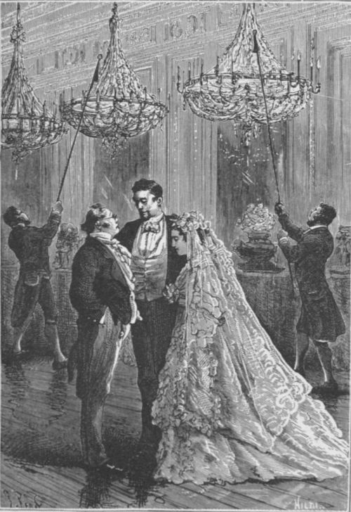 285Thus it happened that on the 14th of February, 18—, a numerous crowd was collected in the dim aisles of St. Mungo, the old cathedral of Glasgow. There were seamen, merchants, manufacturers, magistrates, and some of every denomination, gathered here. There was Miss Jenny in bridal array, and beside her the worthy Crockston, resplendent in apple-green clothes, with gold buttons, whilst Uncle Vincent stood proudly by his nephew.