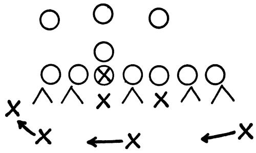 We set up a skeleton offensive unit of ends, center and a complete backfield versus the defensive ends and secondary, as illustrated in Figure 126. The offense works full speed running its outside plays and passes, and the defense is drilled in stopping the wide attack.