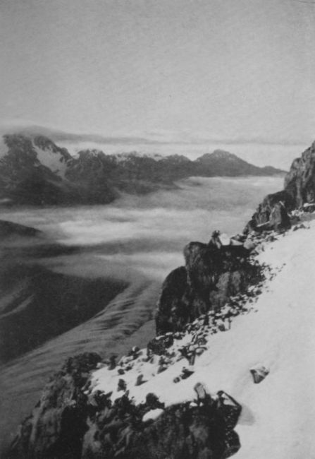 In Southern New Zealand the line of perpetual snow is much lower than it is in the Alps of Europe. It varies, of course, in different parts of the range; but generally speaking, a mountain 12,000 feet high in New Zealand carries as much snow and ice as one of 15,000 feet in the Swiss Alps, and New Zealanders point with pride to glaciers comparable to the Aletsch and the Mer de Glace. On the west, some of the great ice-streams descend to within seven hundred feet of sea-level, and below the line of perpetual snow the steep declivities are covered with a thick and tangled forest, extremely difficult to penetrate, where tree ferns grow luxuriantly in the depths of the gorges. The region is one of the wettest and most thickly wooded in the world; and it is a region that might have lain long unexplored, except in those few spots where gold has been found, had it not been for the growth, about seventy years ago, of the passion for mountaineering, which has carried British climbers all over the earth in search of places where their prowess could find a field for its display. The first who forced their way into it were some New Zealand Government surveyors in 1862.
