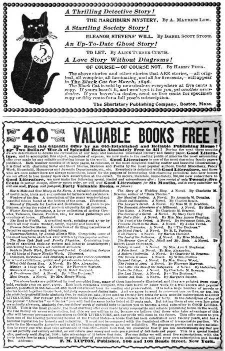 The above books are published in neat pamphlet form, many of them handsomely illustrated, and they are printed from clear, bold, readable type on good paper. Each book contains a complete, first-class novel or other work by a well-known and popular author, published in the handiest and most convenient form for reading and preservation. It is not a large number of novels or stories bound together in one book, but forty separate and distinct books. And we agree to send to you—not one, or five, or ten, but the whole forty splendid books absolutely free, by mail post-paid, if you send us twenty-five cents for a six months’ subscription to GOOD LITERATURE. Our regular price for these books is five cents each, or two dollars for the set of forty. In the catalogues of any of the popular “Libraries” or “Series” you will find the same books listed at 25 cents each. But taking them at our own low price we actually give you, absolutely free, two dollars’ worth of splendid books to induce you to become a trial subscriber to GOOD LITERATURE. This is the most gigantic, the most startling offer ever made by any responsible and reliable publishing house in the world. We lose money on every subscription, but this we are willing to do, because we believe that those who take advantage of this offer will become permanent subscribers to GOOD LITERATURE, and our profit will come in the future. This offer comes to you from one of the leading publishing houses in the United States—a house that has been established over twenty years, and has a national reputation for honesty and reliability. It must not be compared with the fraudulent offers of irresponsible parties. We refer to the Mercantile Agencies and to all the leading newspapers as to our reliability. We guarantee perfect and entire satisfaction to every one who shall take advantage of this offer—more than that, we guarantee that if you can conscientiously say that you are not perfectly and entirely satisfied, we will return your money and make you a present of both books and paper. This is a special limited offer, good only until May 1st, 1896; take advantage of it before that date. For one dollar we will send five subscriptions, with the forty books free to each; therefore by getting four of your neighbors to subscribe you will get your own subscription and books free. Address: F. M. LUPTON, Publisher, 106 and 108 Reade Street, New York.