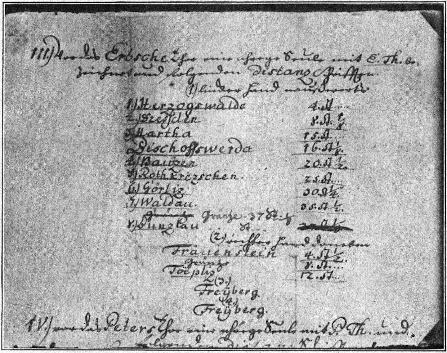 Der geldliche Aufwand, den eine so prunkvolle, arbeitsreiche Idee zu ihrer Durchführung erfordert, erscheint selbst in damaliger Zeit nichts weniger als gering.[75] Für einen Souverän, wie August der Starke, lagen die Dinge in finanzieller Beziehung aber trotzdem sehr einfach. Seine Kassen waren leer. Die Kosten für die »allergnädigst verliehenen Distanzsäulen« mußte also jede Stadt aus ihrem Säckel bestreiten und für die Meilensäulen am Wege mußten die anliegenden Gemeinden und Grundherren Sorge tragen.