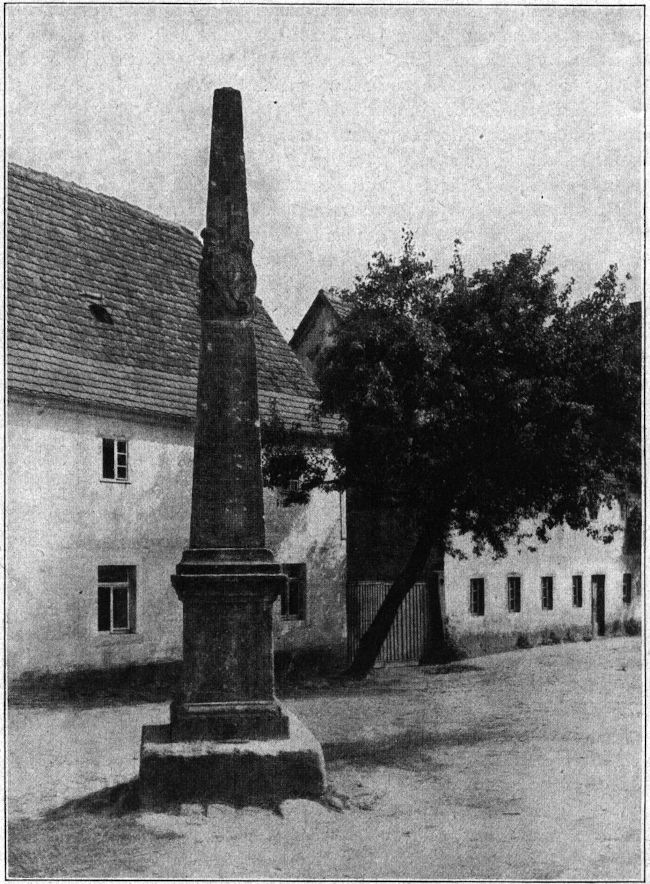 Auf eine Kette von nicht weniger als fünf guterhaltenen Stücken stoßen wir schließlich an der einstigen Prager Poststraße, die über die erzgebirgischen Höhenrücken von Dohna nach Börnersdorf verlief und gegenwärtig nur noch der Verbindung von Dorf zu Dorf dient. Dem ausgebesserten Viertelsteine in Dohna folgt ein Meilenobelisk bei Köttwitz (vgl. Abb. 4.) Dann treffen wir in richtigen Abständen auf zwei weitere Viertelmarken in Börnersdorf und am Haarthewald (vgl. Abb. 5), sowie nochmals auf die ganze Meile bei Breitenau. Zu diesem Straßensystem hat noch ein Halbmeilenstein nordöstlich der Fürstenwalder Kirche gezählt. Einige Sandsteinstücke, die ich dort im Jahre 1912 am westlichen Straßenrand vorfand, mögen davon herstammen. Im Abstand einer weiteren Viertelmeile beim Haferfeldwald zeigt der Oberreitsche Atlas (Blatt Altenberg) kurz vor der[83] Landesgrenze nochmals einen Viertelmeilenstein; es ist mir bisher aber nicht gelungen, seinen Verbleib zu ermitteln.