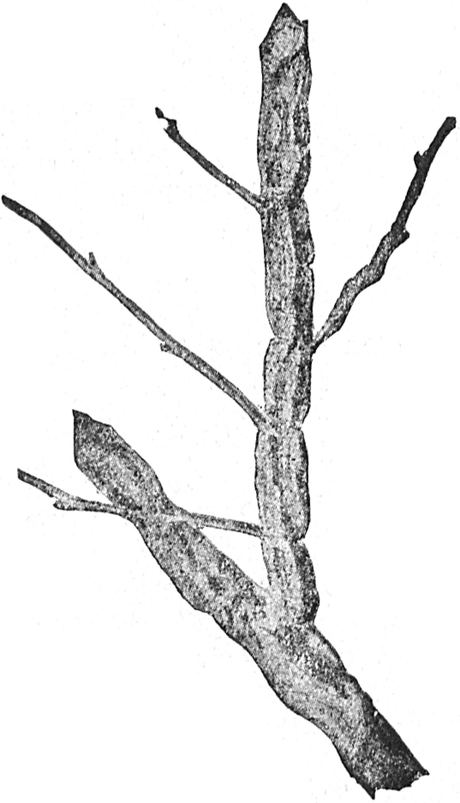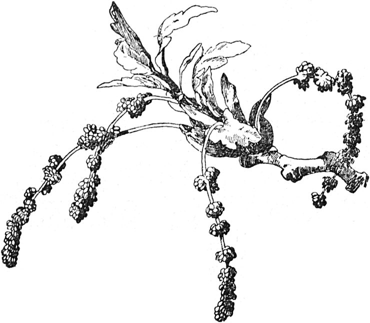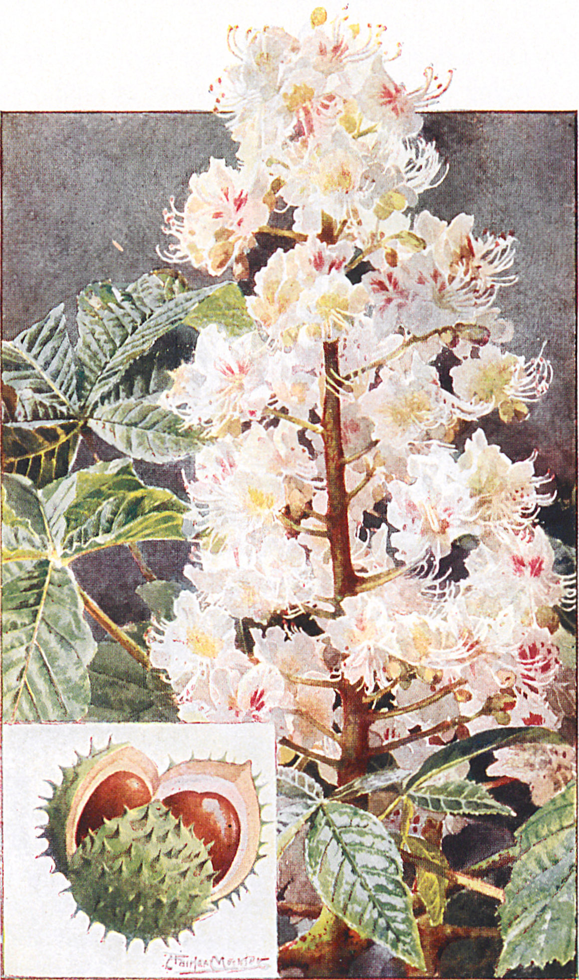 Wenn ein junger Baum reichlich Holz und Zweige gebildet hat, beginnt er, einige seiner Knospen zu benutzen,[S. 16] um Blüten zu bilden. Diese Blütenknospen wachsen an denselben Stellen wie die Blätterknospen. An einigen Bäumen wachsen sie da, wo das Blatt aus dem Stamm hervorwächst. Bei anderen wachsen sie an der Spitze der Zweige. Sie sind im allgemeinen runder und weniger spitz als die Blätterknospen. Die Blüten der Eiche sind sehr klein, deshalb tut man besser, sich nach einem Roßkastanienbaum umzusehen und einen Zweig desselben für diese Lektion zu brechen. Man wird auf einer Roßkastanie fast zu jeder Zeit des Jahres Blütenknospen finden, ausgenommen, wenn er im vollen Blätterschmuck steht, denn dann sind sie sehr klein.