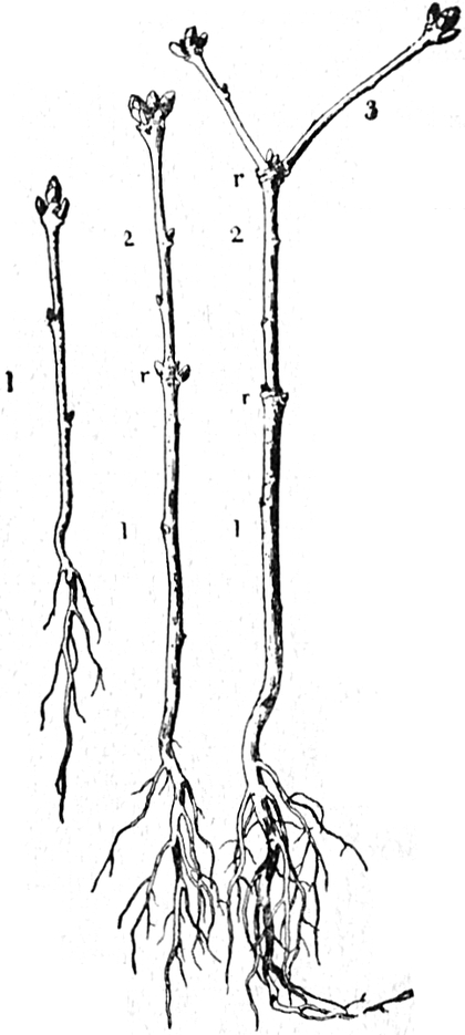 Nun beobachtet eure kleine Pflanze im nächsten Frühling. Ihr werdet sehen, wie aus der dicken Knospe an der Spitze und oft noch aus zwei anderen, die dicht daneben stehen, sich Zweige entwickeln, die eigene Blätter haben. Aber bei einem sehr jungen Baume sterben die kleineren gewöhnlich ab, und der Stamm wächst gerade in die Höhe. Man kann jedoch immer feststellen, wo das neue Wachstum im Frühling begann, weil sich dort ein Ring (s.Abb. S. 12, r)[S. 14] befindet, der von den Schuppen der Knospen zurückgelassen wird. Das Holz des neuen Stückes wird gerade so sein wie das Holz des unteren Stückes im vorigen Jahre war. Aber dieses untere Stück setzt frisches Holz an und wird dicker (Fig. 2, S. 13). Der Saft steigt hinauf und hinunter, und ein neuer Ring von Holz bildet sich außerhalb des alten, ebenso wie ein sehr dünner neuer Ring von Rinde innerhalb der alten. So wird am Ende des zweiten Jahres das alte Stück unter den Schuppen zwei Holzringe haben (w und w2) mit einer Linie dazwischen, die zeigt, wo der Baum im Winter ruhte; das neue Stück dagegen hat nur einen Ring.