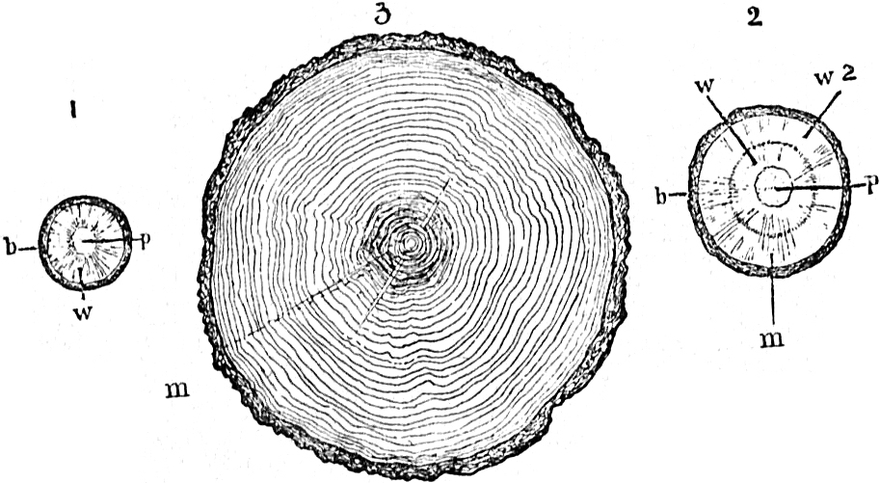 Es gibt auch Bäume, wie die Palmen, die ihr in Warmhäusern seht, die keine Ringe ansetzen. Aber sie sind keine bei uns wachsenden Bäume und gehen uns hier nichts an.