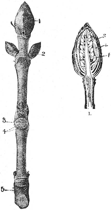 Die beste Zeit darnach zu suchen, ist am Ende des Winters, wenn der Baum kahl ist. Zuerst sieh die kleineren Knospen an, die zu zwei und zwei einander am Zweige gegenüberstehen. Unter jeder Knospe sieht man eine Narbe, die die Stelle bezeichnet, wo das Blatt im letzten Jahre wuchs. Die Narbe hat die Form eines Pferdehufes und hat verschiedene schwarze Flecke, die wie die Nägel angeordnet sind. Diese Stellen zeigen, wo die Röhrenbündel waren, die den Saft in das Blatt führten.