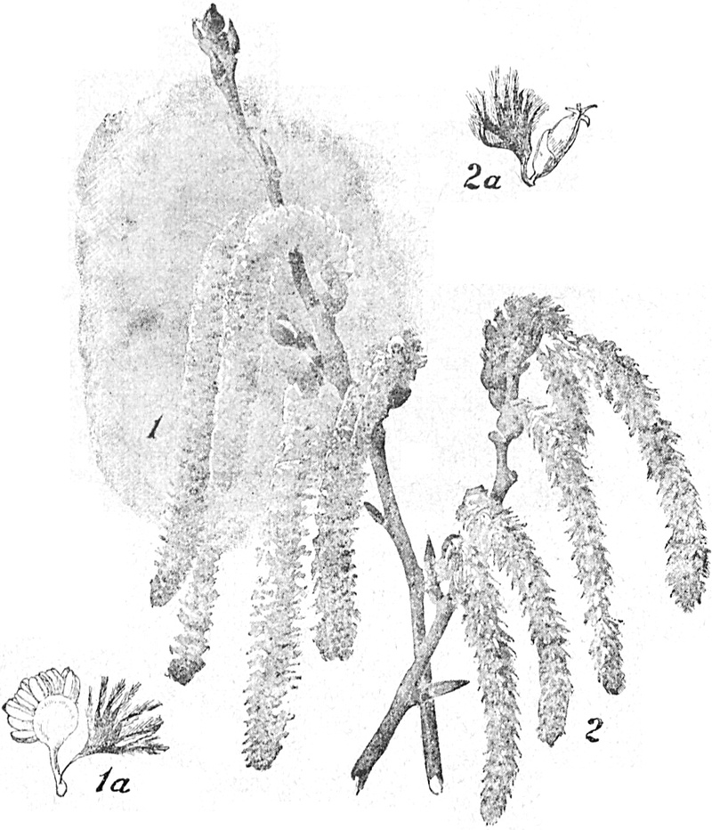 Birke und Erle sind gleichfalls Bäume mit Kätzchen und hartschaligen Früchten. Sie blühen früh im Jahre, ehe die Blätter heraus sind. Die Erle wächst am Ufer von Flüssen oder auf feuchtem Boden. Die Birke findet sich in Wäldern und ist an ihrem schlanken Stamme zu erkennen, dessen silberweiße Rinde weithin leuchtet, an ihren dunkelbraunen Zweigen und ihren dunkelgrünen Blättern, die nach dem Regen sehr stark duften, weil das Harz aus ihnen herausquillt. Manche kranke Birken haben große Büschel von Zweigen, die auf den oberen Ästen wachsen und wie Krähennester aussehen.