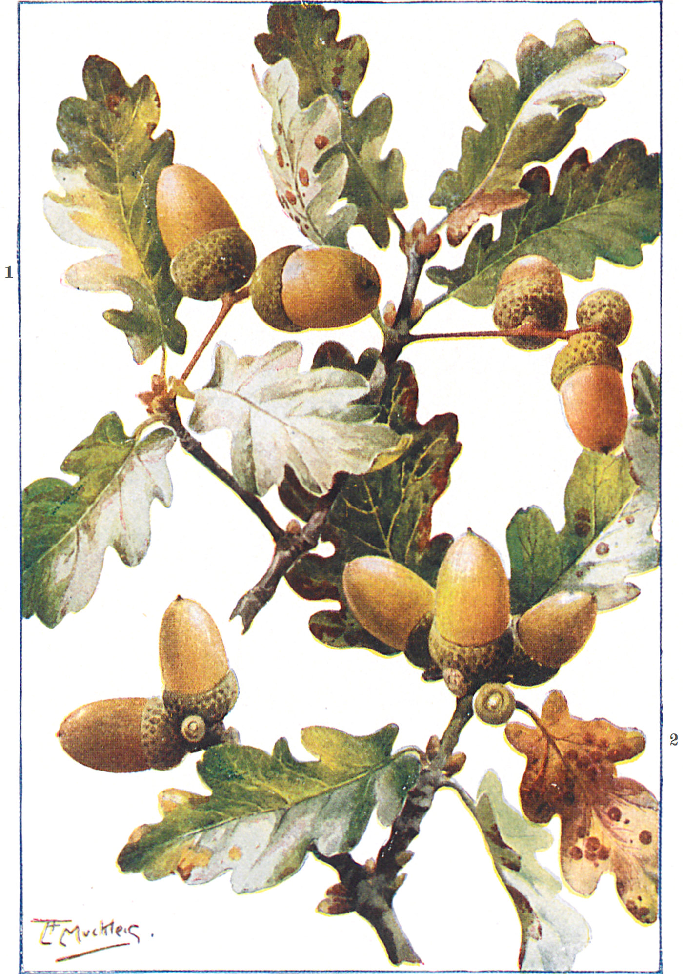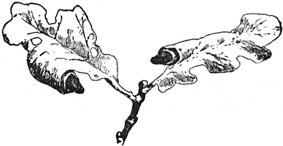 Zuerst treibt die Eichel aus einem Spalt einige Wurzeln nach unten. Dann spaltet sich die Schale vollständig, und man kann sehen, wie sich die beiden dicken Keimblätter öffnen, zwischen denen die wachsende Spitze liegt. Diese Spitze wächst nun beständig nach oben und treibt bald einige Blätter. Es ist manchmal eins, manchmal sind es auch zwei, eins über dem anderen, an der Seite des Stammes.[S. 12] Aber wenn der Herbst kommt, werden sicher zwei oder drei dicht zusammen an der Spitze des kleinen Baumes stehen. Unten an jedem Blatte dicht am Stamme sitzt eine kleine Knospe und am oberen Ende des Stammes eine kräftige Knospe, dicker als die übrigen.