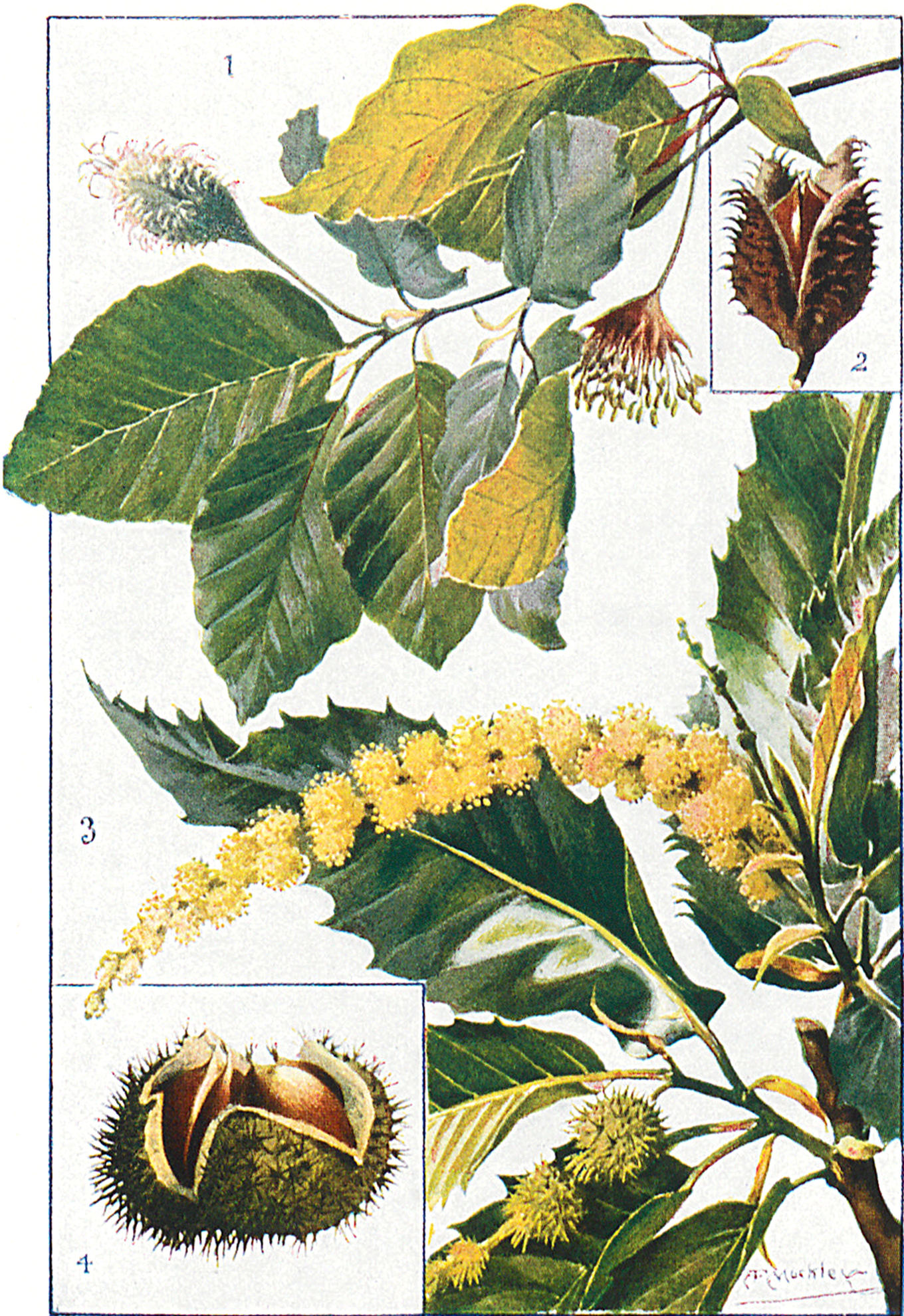 Wenn der Baum groß geworden ist, so trägt er Blüten und Früchte. Diese Früchte und ihre Samen dienen vielen Lebewesen als Nahrung. Die Vogel nähren sich von Beeren, Nüssen und Eicheln. Das Eichhörnchen baut sich ein Nest in Buchen und frißt alle Arten von Nüssen, die es finden kann. Für Feldmaus, Igel und Schwein bilden die Bucheckern und Eicheln eine vortreffliche Nahrung, die sie auf dem Boden finden, während wir die Frucht der Edelkastanie (Marone), des Walnußbaumes und Äpfel, Birnen und Kirschen aus dem Obstgarten essen.