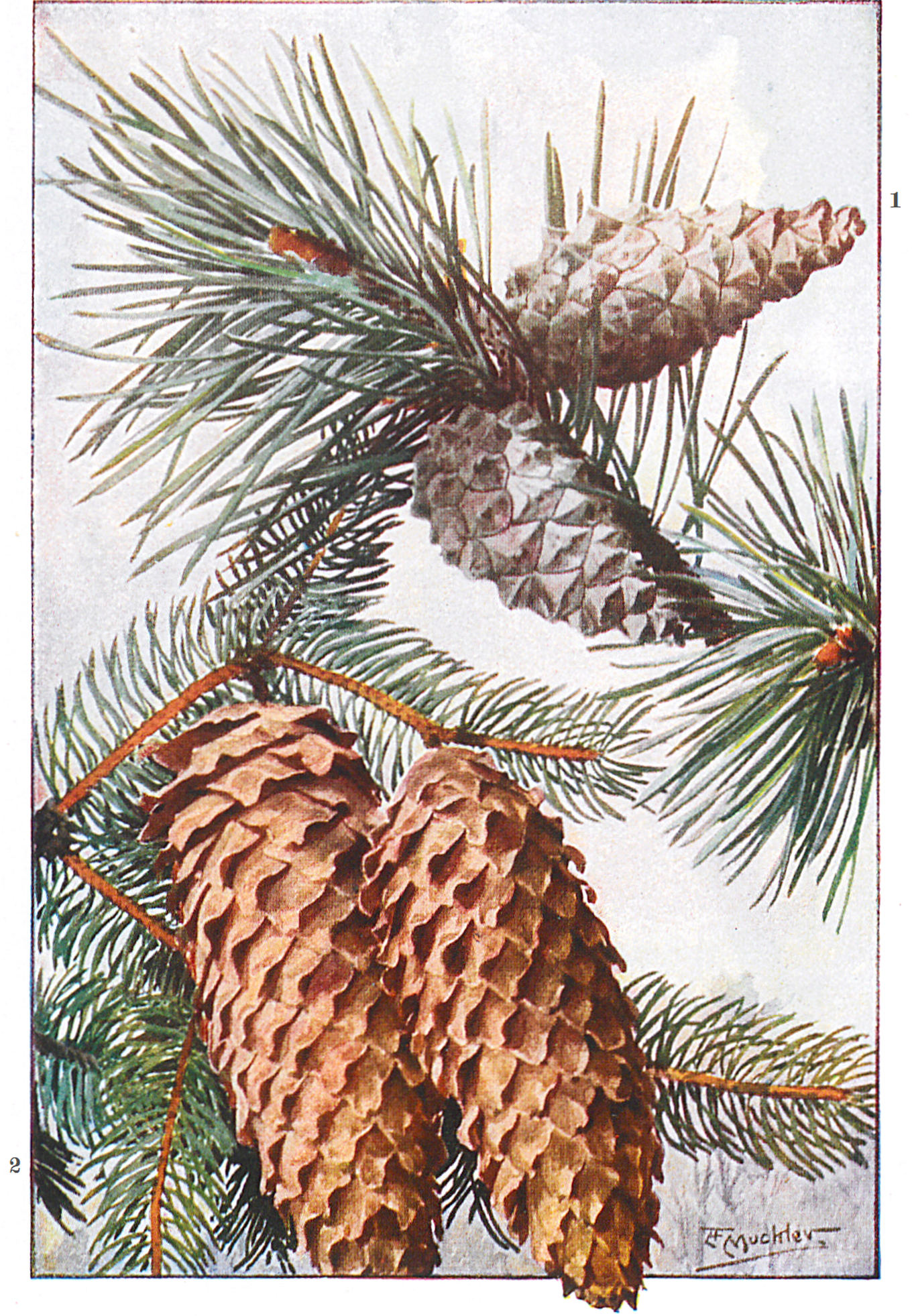 Die Kiefer ist ein mächtiger Baum mit ausgebreiteter Krone, dessen Stamm mit einer rotbraunen, tiefrissigen Rinde bedeckt ist. Die dunkelgrünen Blätter sind sehr schmal und ungefähr 5 cm lang (vergl. bunte Tafel V, 1). Sie wachsen zu zweien in einer Scheide aus braunen Schuppen. Ihre Zapfen haben fast keine Stiele, sie buchten sich am unteren Ende aus und verjüngen sich nach oben hin zu einer stumpfen Spitze. Sie bestehen aus einer Anzahl dicker holzartiger Schuppen, die aussehen, als wären sie am Ende zurückgebogen. Das bewirkt eine verdickte kopfförmige[S. 40] Stelle mit einem braunen, schuppigen Flecke am Ende der Schuppenspitze. Diese Schuppen liegen so dicht übereinander, daß, ehe die Zapfen reif sind, kein Tropfen Regen hineindringen kann, und es dauert zwei, auch drei Jahre, bis sie reif werden. Manchmal hängen sie während dieser ganzen Zeit an dem Baume. Manchmal fallen sie früher ab. Sobald sie reif werden, biegen sich die holzartigen Schuppen nach außen, und man kann im Innern einer jeden zwei durchscheinende Schuppen sehen, die die Form eines Fliegenflügels haben. Sie stehen aufrecht an der holzartigen Schuppe.